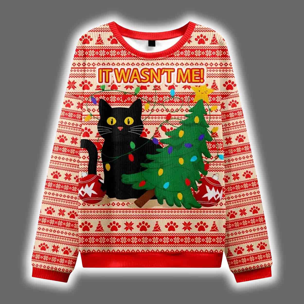 This hilariously festive sweater captures the spirit of the holidays with a twist of feline rebellion. Set against a vibrant red backdrop adorned with classic snowflakes and seasonal patterns, the centerpiece is a wide-eyed black cat sitting innocently beside a toppled Christmas tree. The tree, once proud and decorated with colorful ornaments and twinkling lights, now lies in disarray—clearly the victim of some curious paws. Above the scene, bold yellow text declares “IT WASN’T ME!”, adding a cheeky punchline to the visual chaos. Whether you’re attending an ugly sweater party or just want to make your family laugh, this design guarantees double takes and giggles.