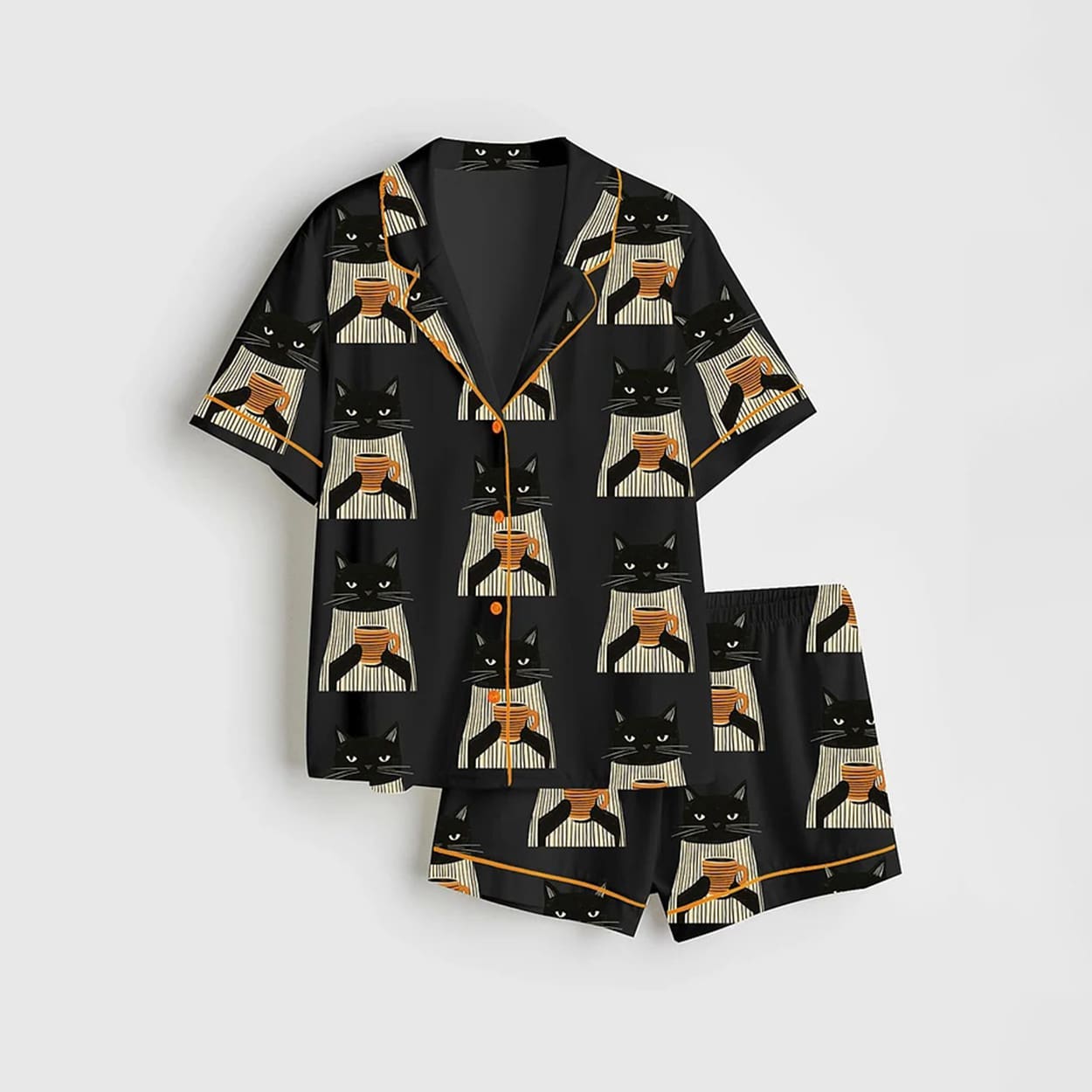 Be the first to review “Black Cat Drinking Coffee Satin Pajama Set” Cancel reply