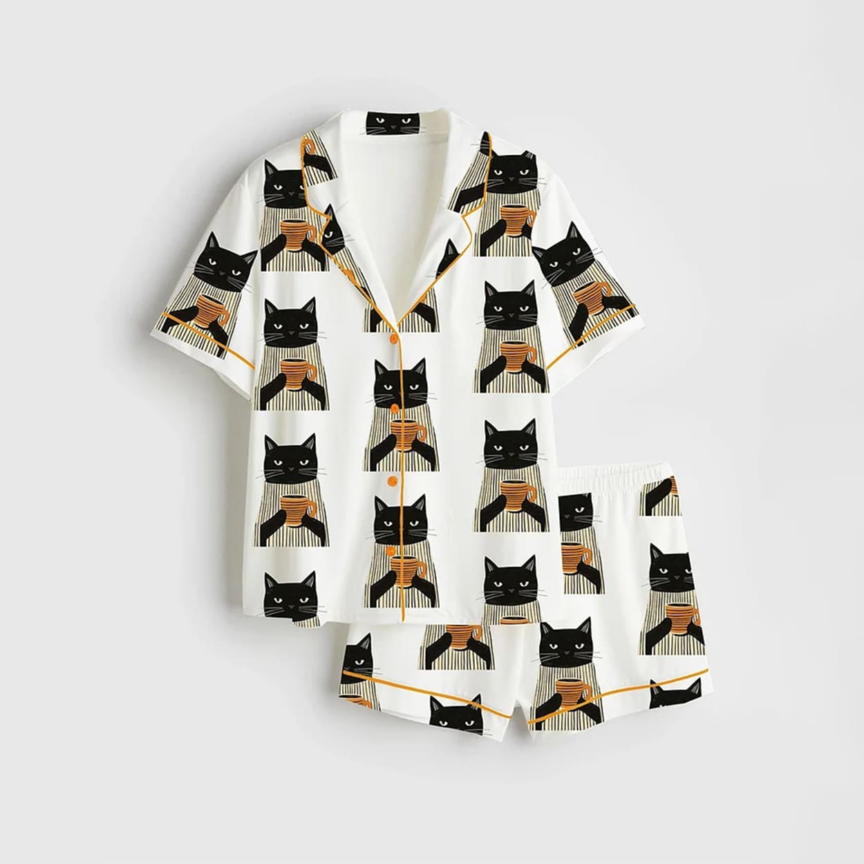 This pajama set is a playful nod to your inner night owl—or early riser with a caffeine addiction. Featuring a short-sleeved button-up shirt and matching shorts, the set is drenched in a rich green hue and adorned with a repeating pattern of cartoonish black cats. Each cat sits upright, dressed in beige attire, clutching a steaming coffee cup with a look of caffeinated determination. Whether you’re lounging at home or hosting a cozy brunch, this set adds a splash of humor and charm to your downtime wardrobe.