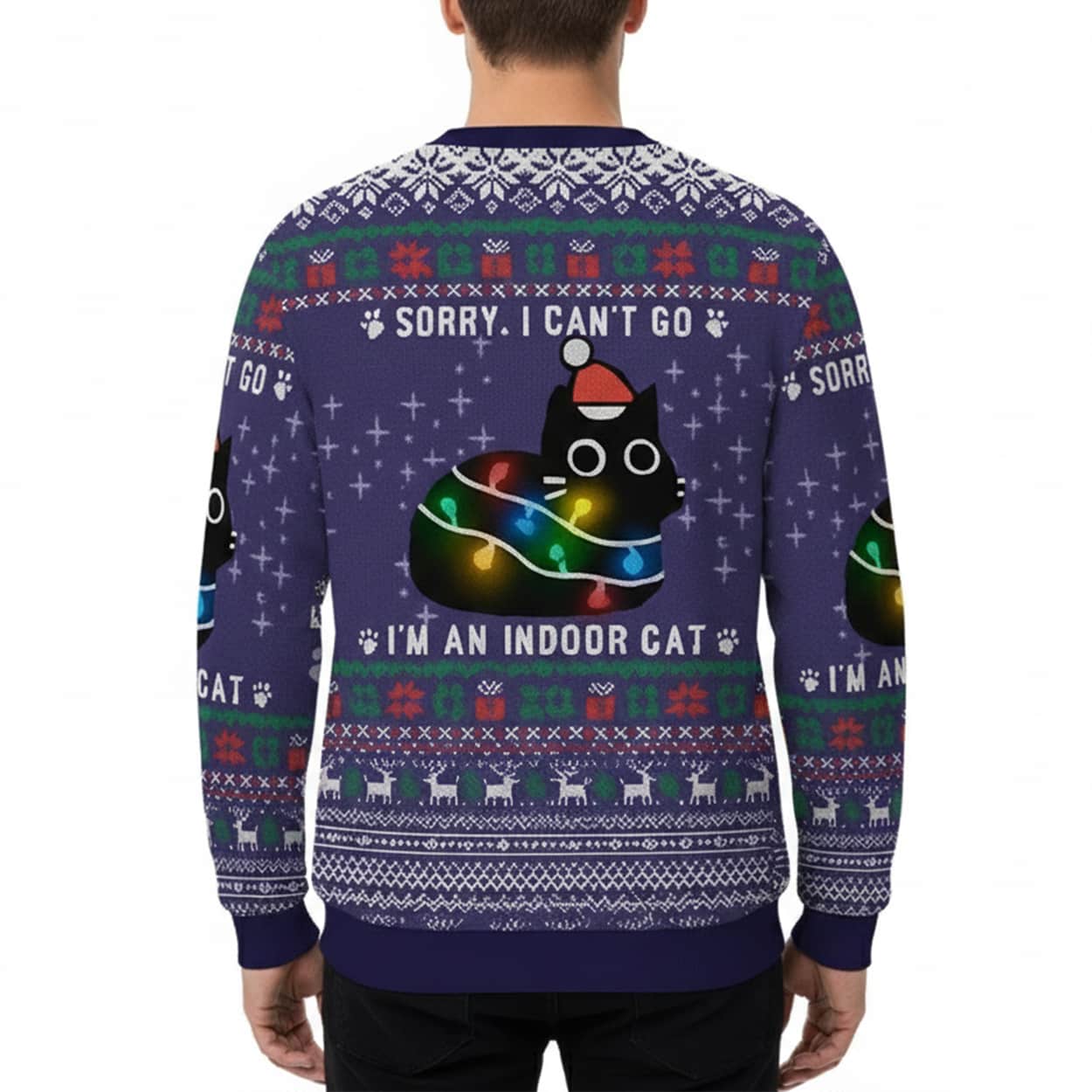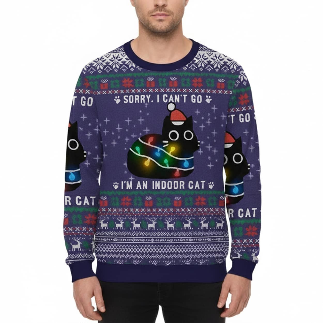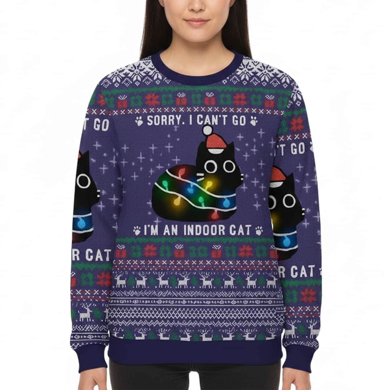 This festive sweater is a purr-fect blend of humor and holiday cheer. Dominated by a rich navy blue base, it bursts with seasonal flair—snowflakes, paw prints, and geometric patterns in red, green, and white. Front and center are two cartoon black cats, each donning a red Santa hat and tangled in colorful Christmas lights. Above them, bold white text declares, “SORRY, I CAN’T GO,” while below, the punchline lands: “I’M AN INDOOR CAT.” It’s a wearable wink to introverts and cat enthusiasts alike.