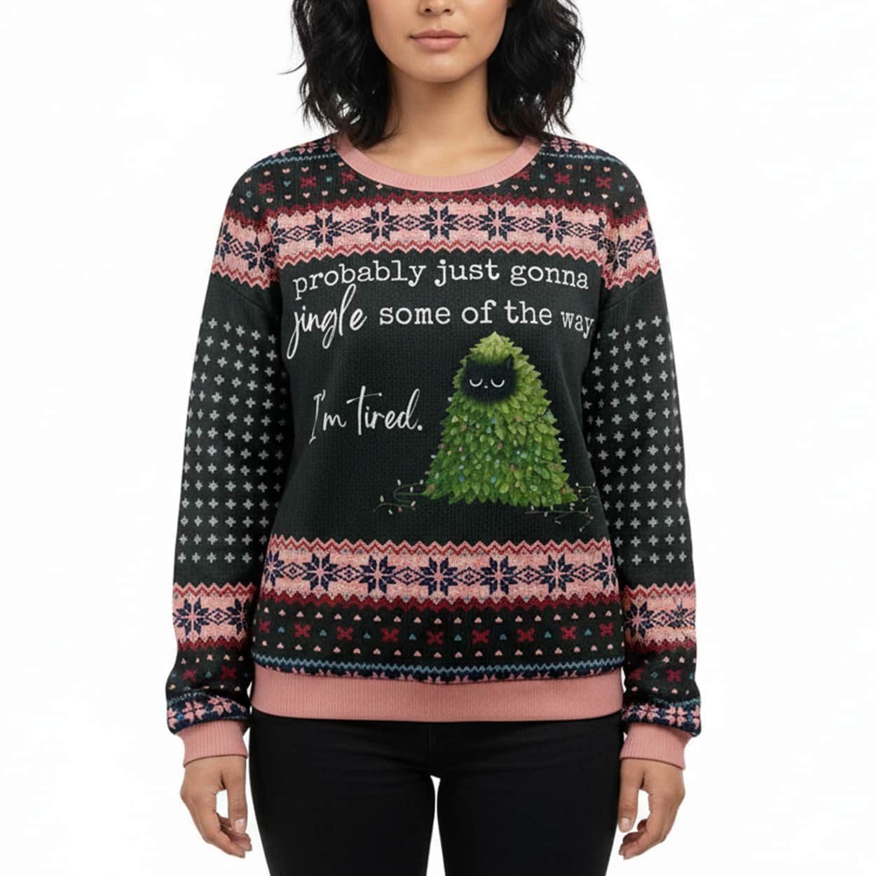Introducing this sweater—a hilarious and relatable twist on traditional holiday wear. This cozy creation features a sleepy green Christmas tree character with a weary expression, surrounded by whimsical snowflakes and stars in pink, white, and black. Front and center, the text reads: “probably just gonna jingle some of the way I’m tired,” capturing the mood of anyone who’s ever felt overwhelmed by holiday hustle. It’s the perfect blend of festive charm and unapologetic honesty.