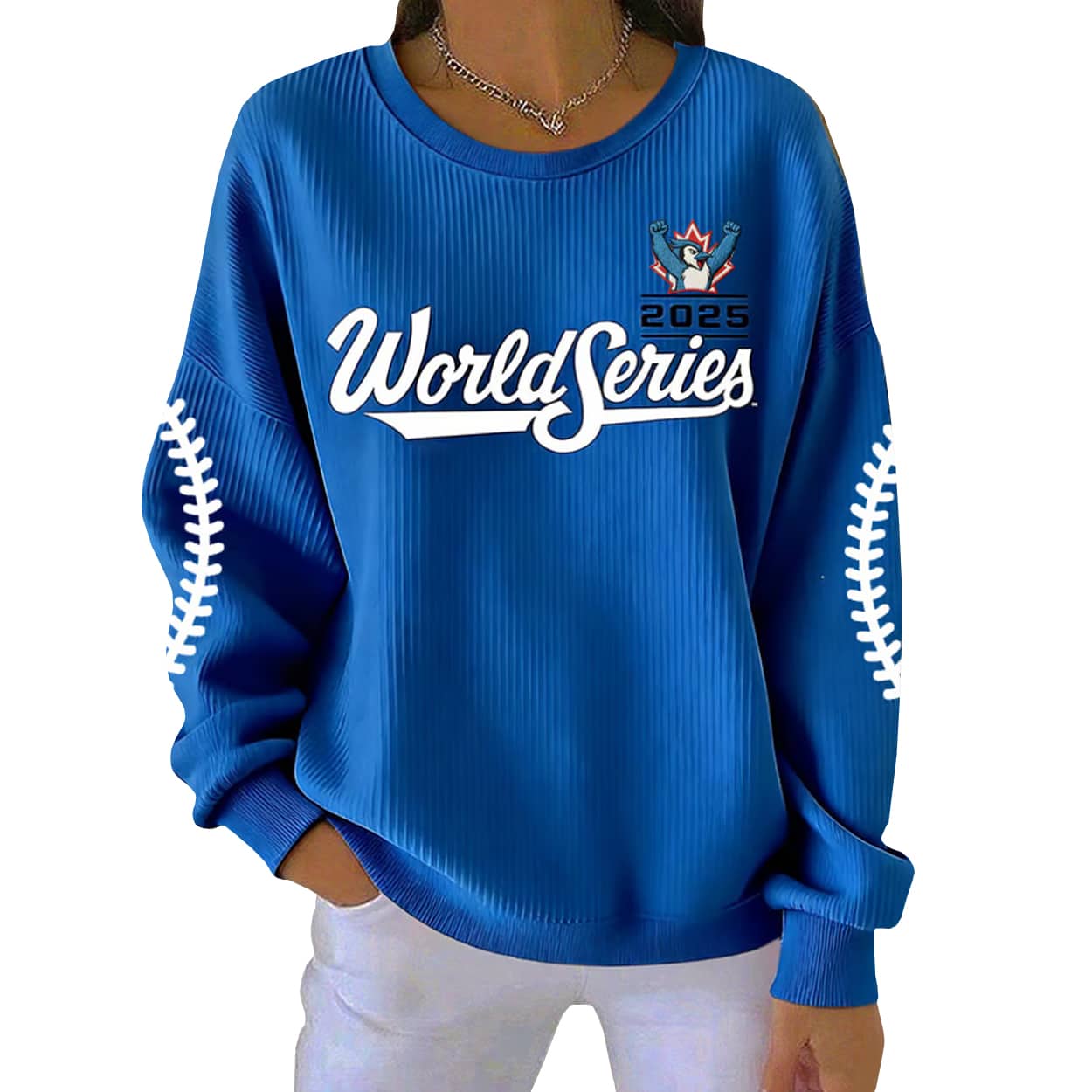 Celebrate the thrill of victory with the Blue Jays 2025 World Series Print Ribbed Sweatshirt—where sporty nostalgia meets bold streetwear. A must-have for fans and fashion-forward thinkers alike.