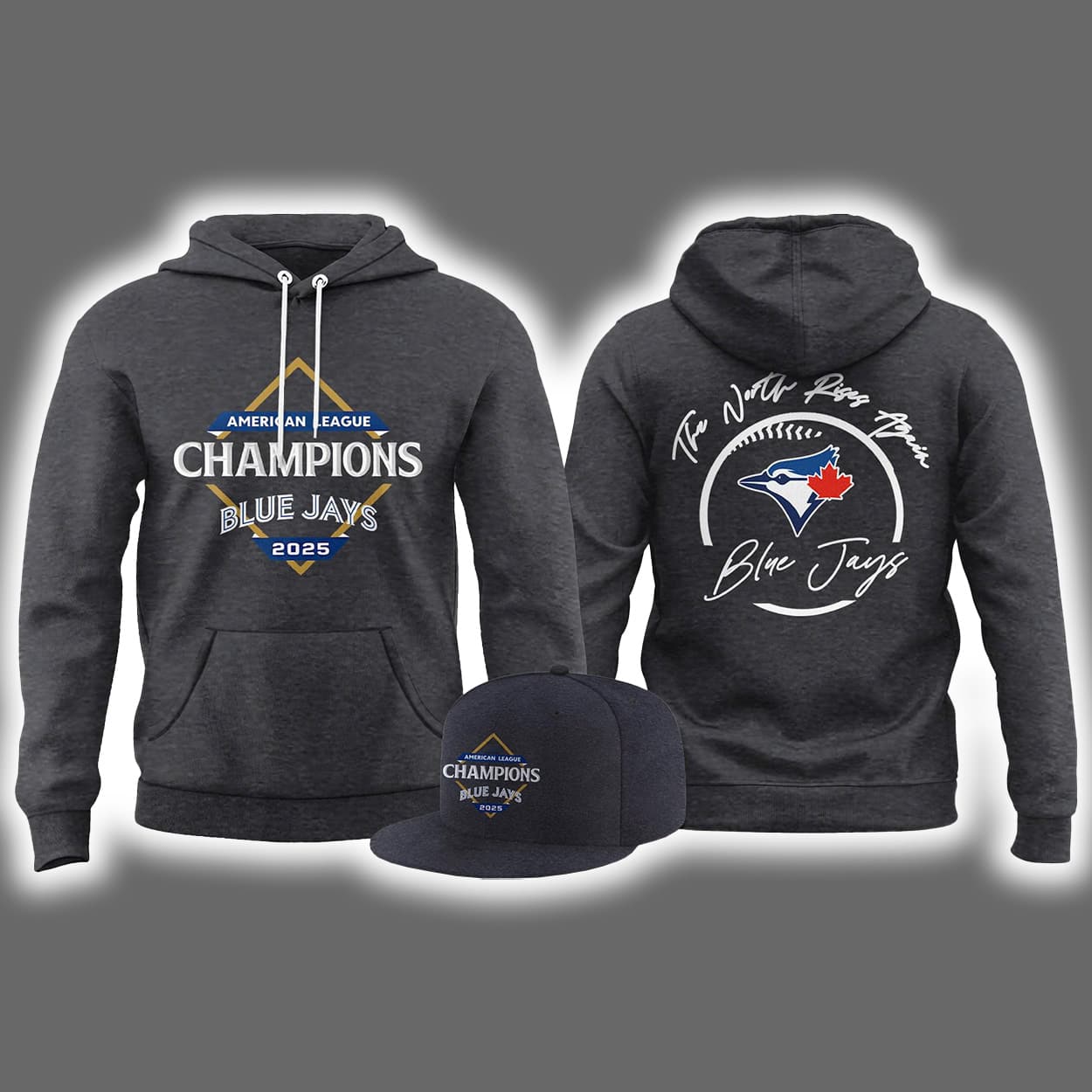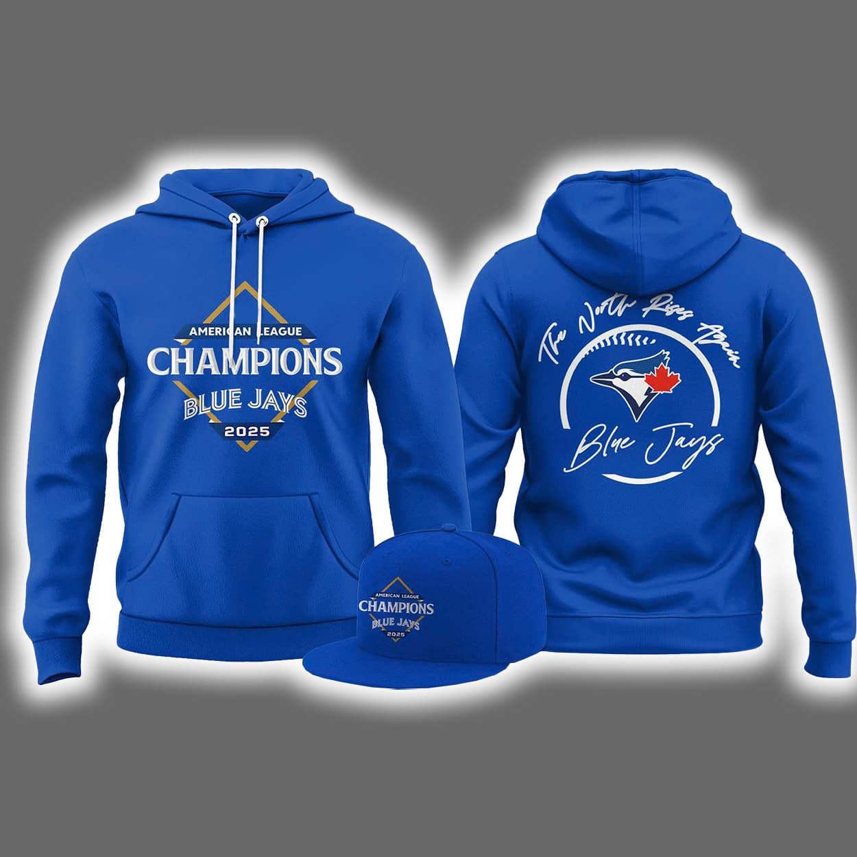 Step into victory with the ultimate fan gear. This electric blue combo screams swagger and celebration. The hoodie’s front boasts the proud proclamation: “AMERICAN LEAGUE CHAMPIONS BLUE JAYS 2025,” framed by a gleaming gold starburst that practically shouts “We run this league!” Flip it around and you’ll find a poetic rally cry—“The North Rises Again BLUE JAYS”—paired with the iconic Blue Jays logo, where the fierce blue jay meets the red maple leaf in a symbol of national pride. The matching cap seals the look with the same championship text, making sure your headwear is just as legendary as your hoodie.