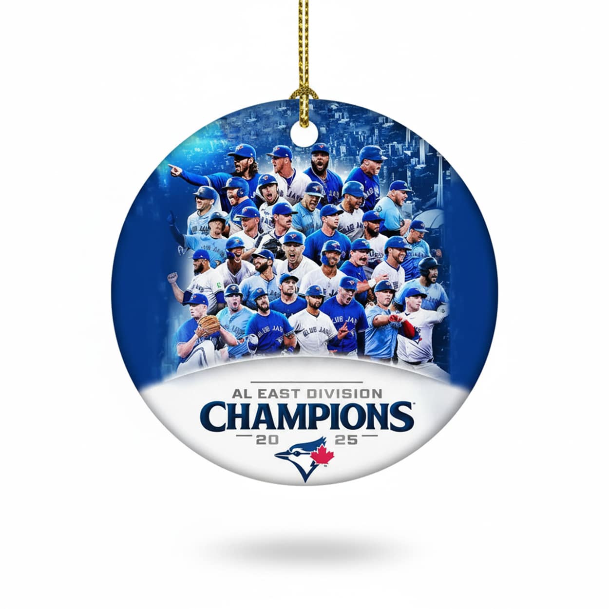 Bring championship energy to your holiday décor with this ornament. This circular gem features a dynamic collage of Toronto players in action, decked out in blue and white uniforms, set against a stadium backdrop bursting with lights and fanfare. At the base, bold text reads “AL EAST DIVISION CHAMPIONS 2025,” anchored by the iconic Blue Jays logo with its signature red maple leaf. Suspended by a gleaming gold string, it’s ready to shine on any tree.