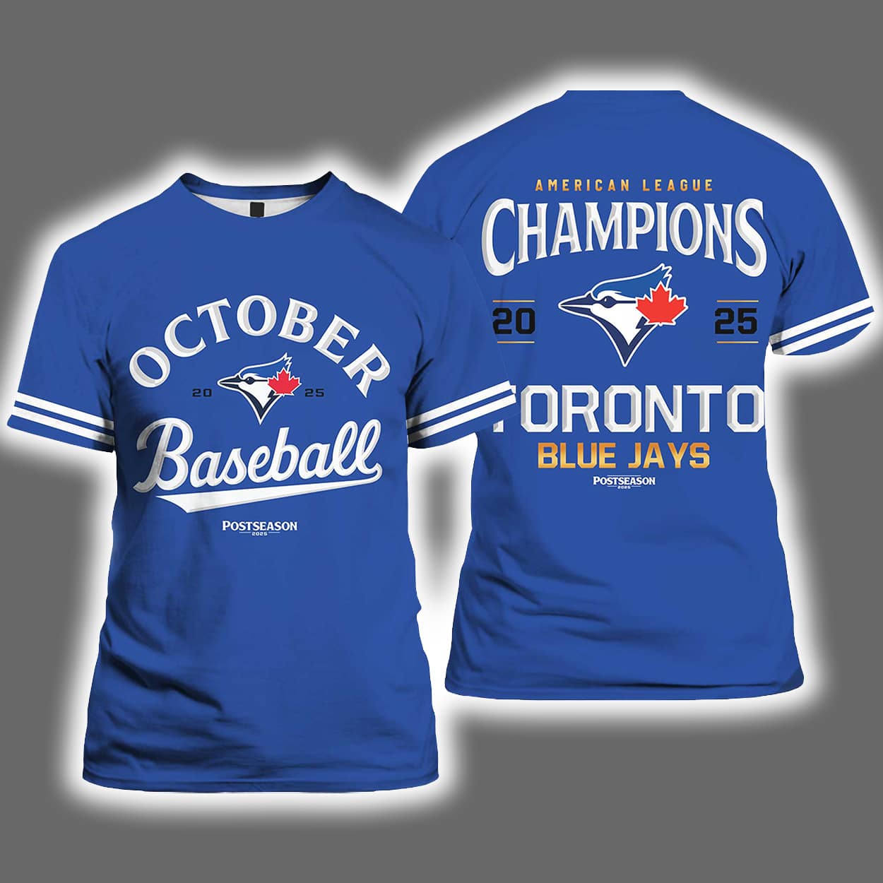 This shirt is a grand slam of style and spirit. The front bursts with postseason energy, featuring the words “OCTOBER Baseball” split by the iconic Blue Jays logo, with “POSTSEASON” stamped below like a ticket to glory. Flip it around and the back declares victory loud and proud: “AMERICAN LEAGUE CHAMPIONS” crowns the top, followed by the Blue Jays logo and the team name in bold, no-nonsense lettering. “POSTSEASON” makes another appearance at the bottom, just in case anyone missed the memo.