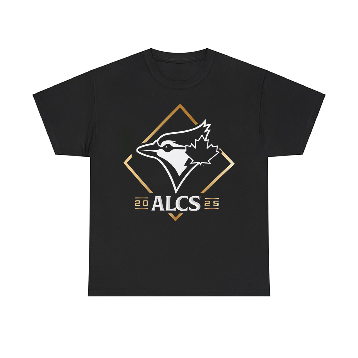 This shirt is your ticket to reliving one of the most electrifying moments in franchise history. Front and center is a sleek, stylized Blue Jay logo—nestled inside a golden diamond that screams postseason prestige. Beneath the bird, the bold white letters “ALCS” take command, flanked by the golden numbers “20” and “25” to mark the year Toronto soared to the top. It’s a wearable trophy for fans who never stopped believing.