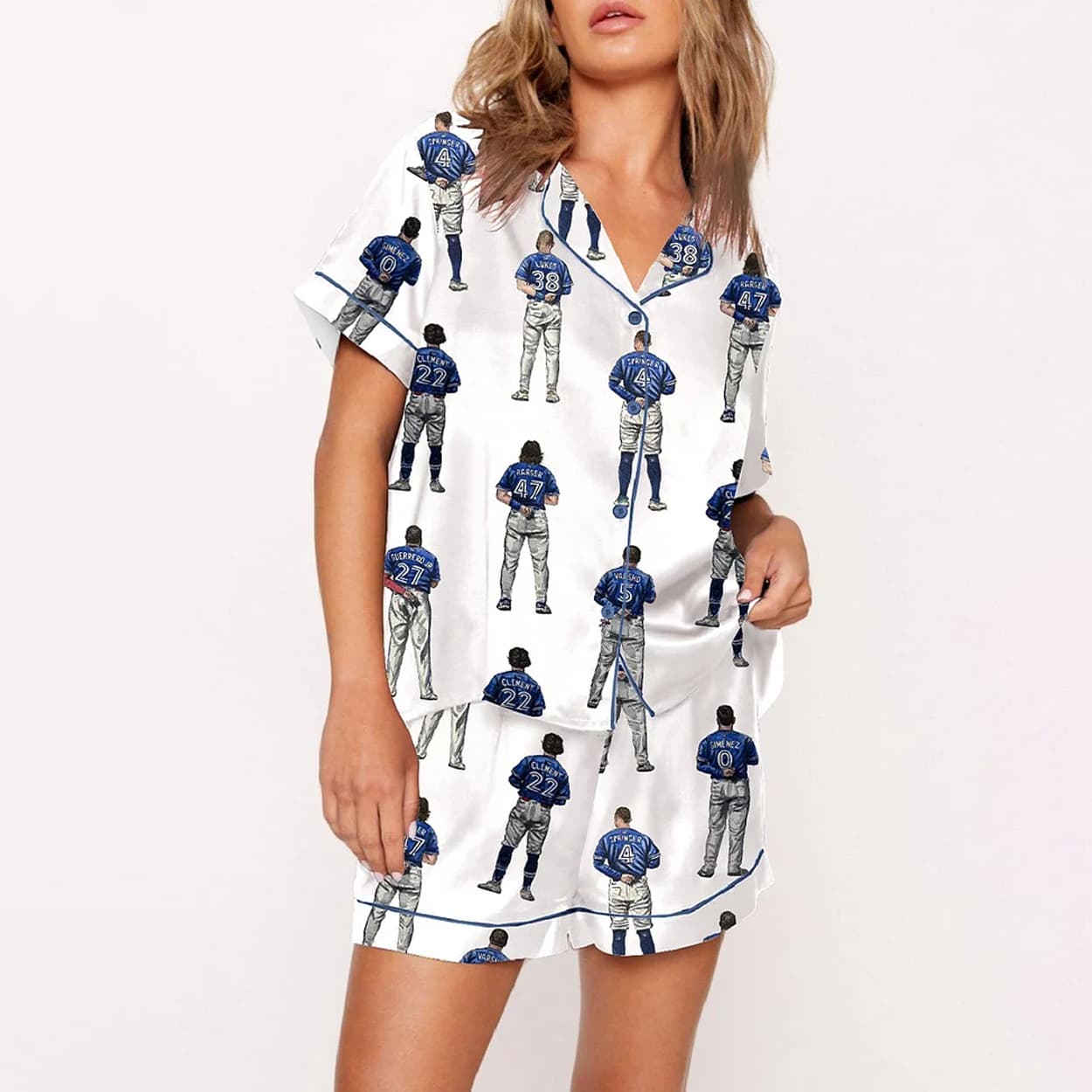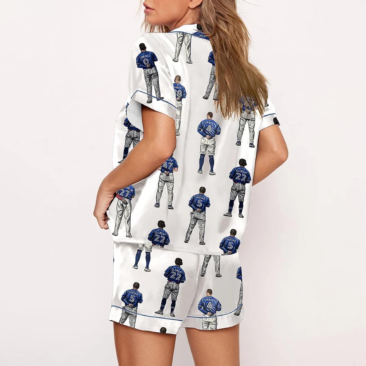 Slide into comfort and swagger with this set, where bedtime meets ballpark flair. This matching short-sleeve button-up and shorts combo is decked out in a playful, all-over print of baseball players standing proudly with their backs turned, each sporting a blue jersey emblazoned. The crisp white background makes the repeated figures pop, turning your PJs into a conversation starter whether you’re lounging at home or hosting a sleepover with fellow fans.