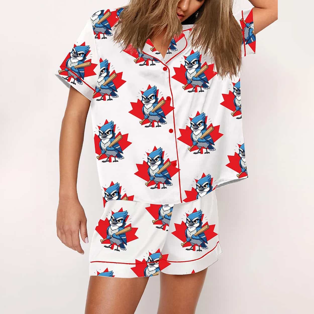 Celebrate Canadian pride and sporty charm with the Blue Jays Canada Baseball The Birds Are Back Satin Pajama Set—where cartoon flair meets national spirit in a bold bedtime look.