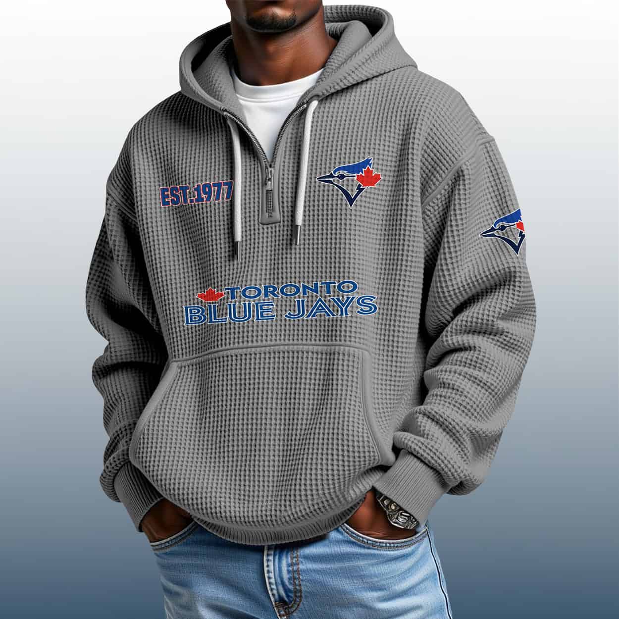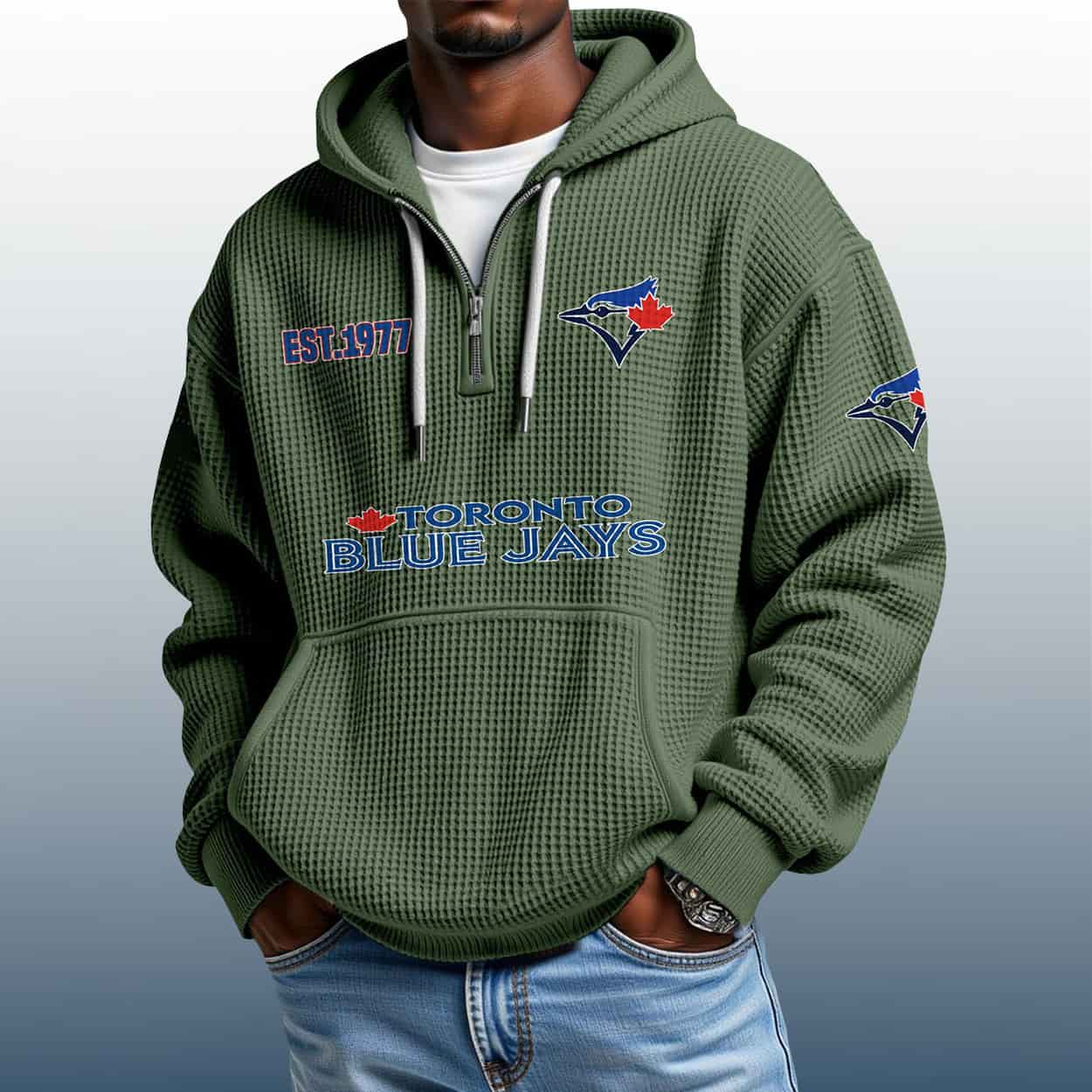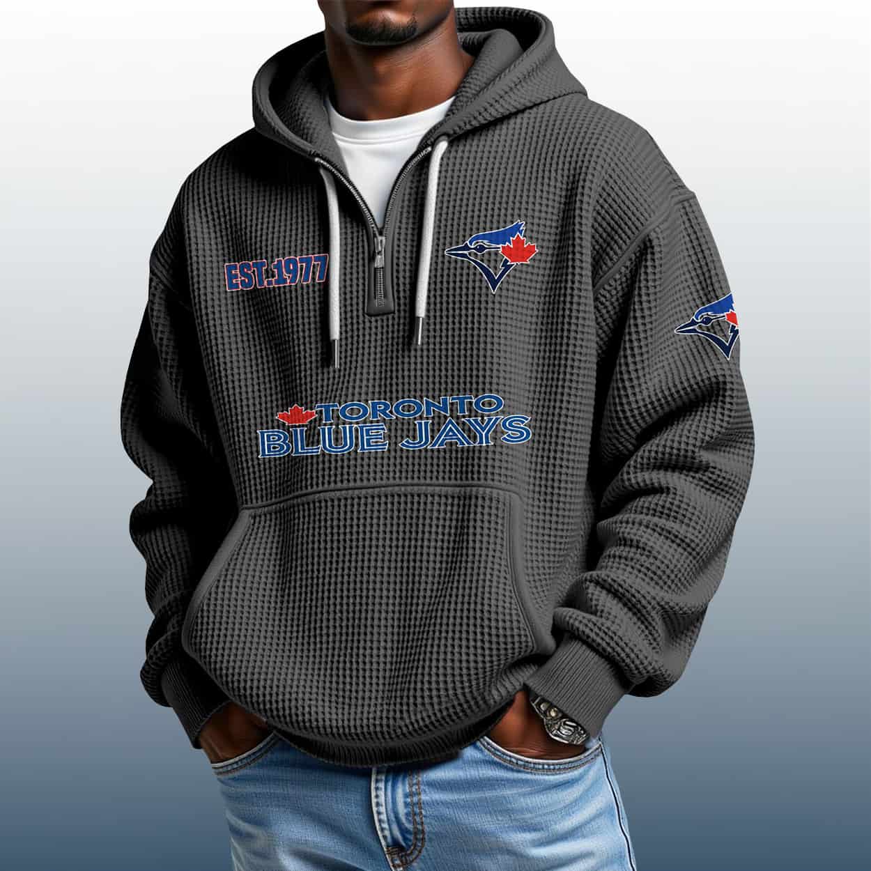 Zip Into Legacy: The Blue Jays Est 1977 Quarter Zip Waffle Hoodie That Hits a Style Home Run