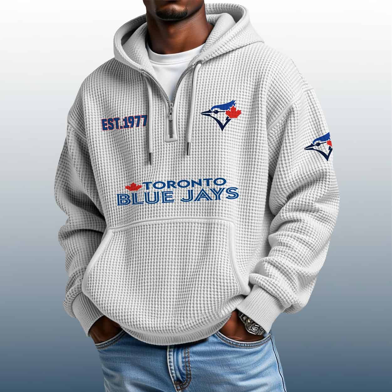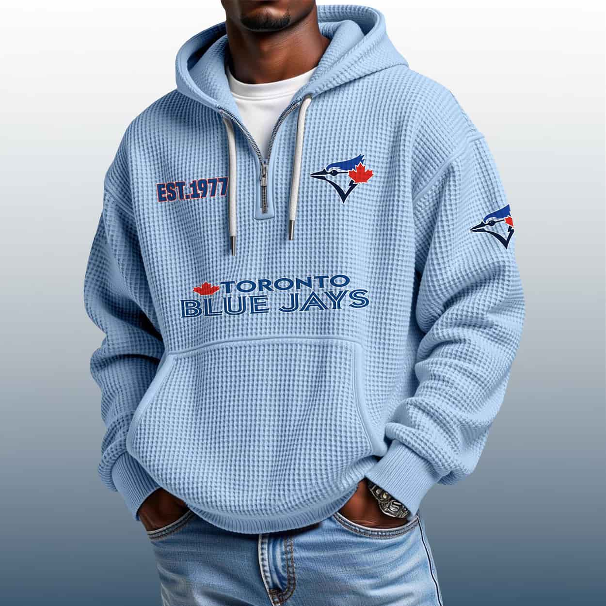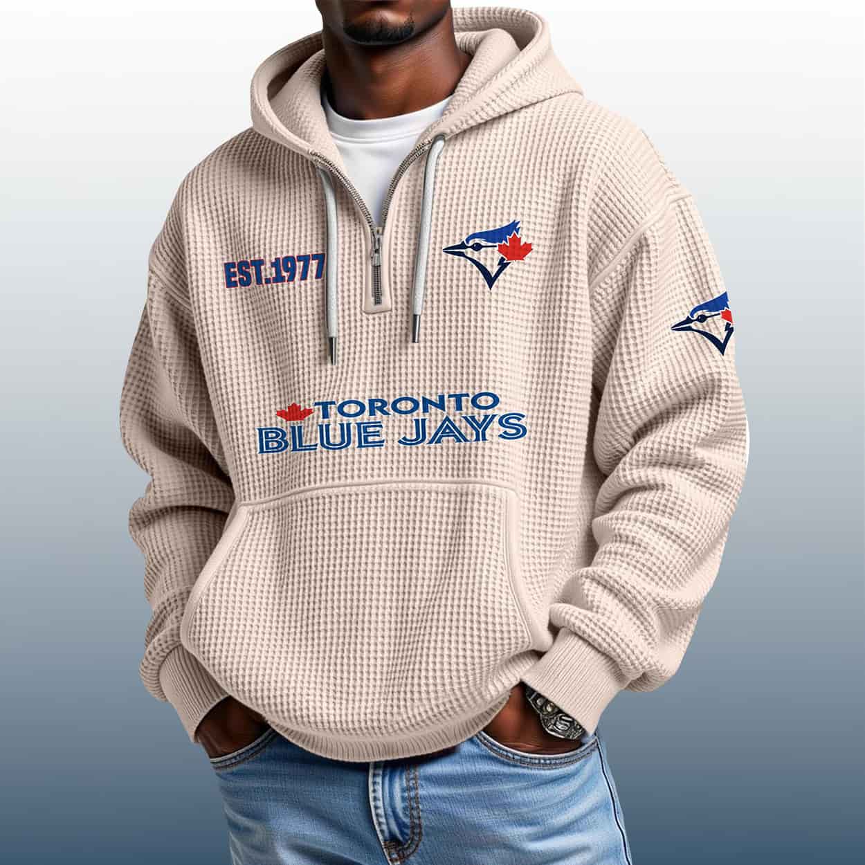 Zip Into Legacy: The Blue Jays Est 1977 Quarter Zip Waffle Hoodie That Hits a Style Home Run