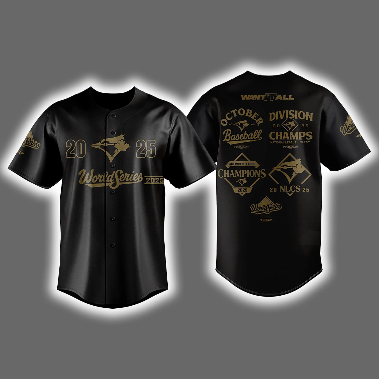 This isn’t just a jersey—it’s a wearable trophy. This jersey is a black canvas of triumph, splashed with gold accents that scream victory. On the front, the year “2025” flanks a fierce Blue Jays bird logo, perched above the proud declaration: “World Series.” Flip it around and the celebration continues—“Want It All” crowns a cascade of golden phrases like “OCTOBER Baseball,” “DIVISION CHAMPS,” “LEAGUE CHAMPS,” and “CHAMPIONS.” Stylized bird emblems and diamond motifs add flair, while “World Series” anchors the bottom in bold confidence.