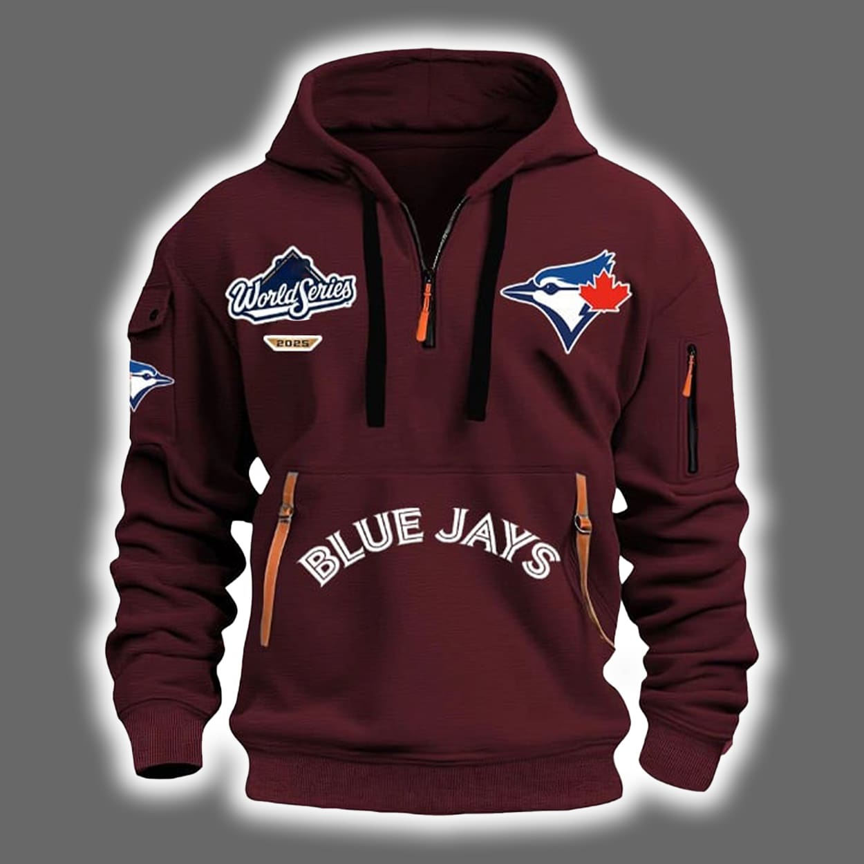 This isn’t just a hoodie—it’s a victory lap. Drenched in royal blue and stamped with the unmistakable Blue Jays logo, this quarter zip pullover is a wearable tribute to the team’s 2025 World Series glory. The chest proudly displays “BLUE JAYS” in crisp white lettering, while a commemorative patch above the logo adds a touch of championship flair. With brown zippers on the front pockets and sleeve, plus a zippered arm pocket for extra edge, this hoodie blends fan pride with functional cool. The hood’s drawstrings and half-zip design make it perfect for layering or standing out solo.