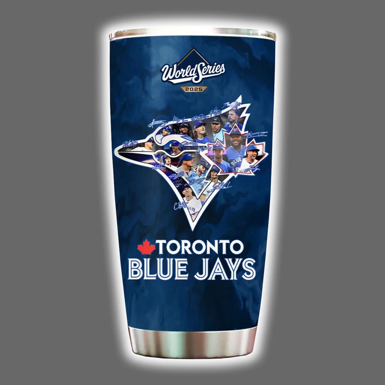 This isn’t just a tumbler—it’s a time capsule of triumph. One side bursts with energy, showcasing a stylized Blue Jays logo filled with action shots of your favorite players, crowned by the words “World Series” and anchored by a proud “TORONTO BLUE JAYS” banner. The deep blue background and subtle team emblem add a sleek, modern edge. Flip it around and you’ll find a vertical lineup of player names, each letter carefully chosen to spell out a bold “TORONTO BLUE JAYS” in red—a subtle but powerful nod to the heroes who brought the championship home.