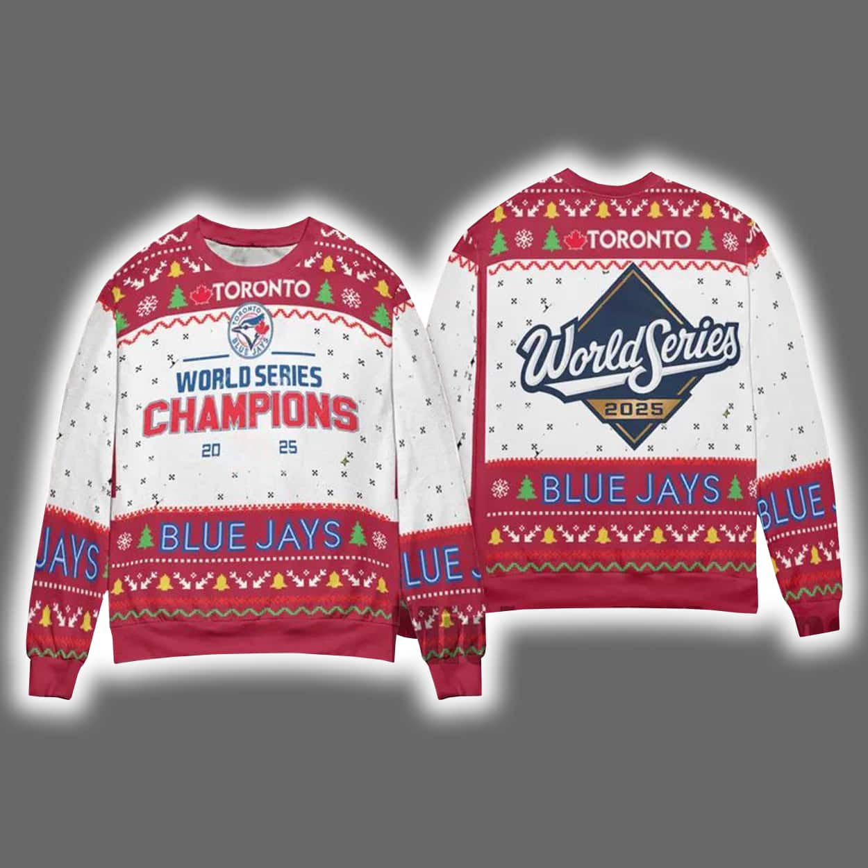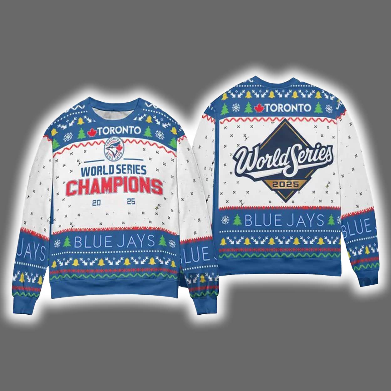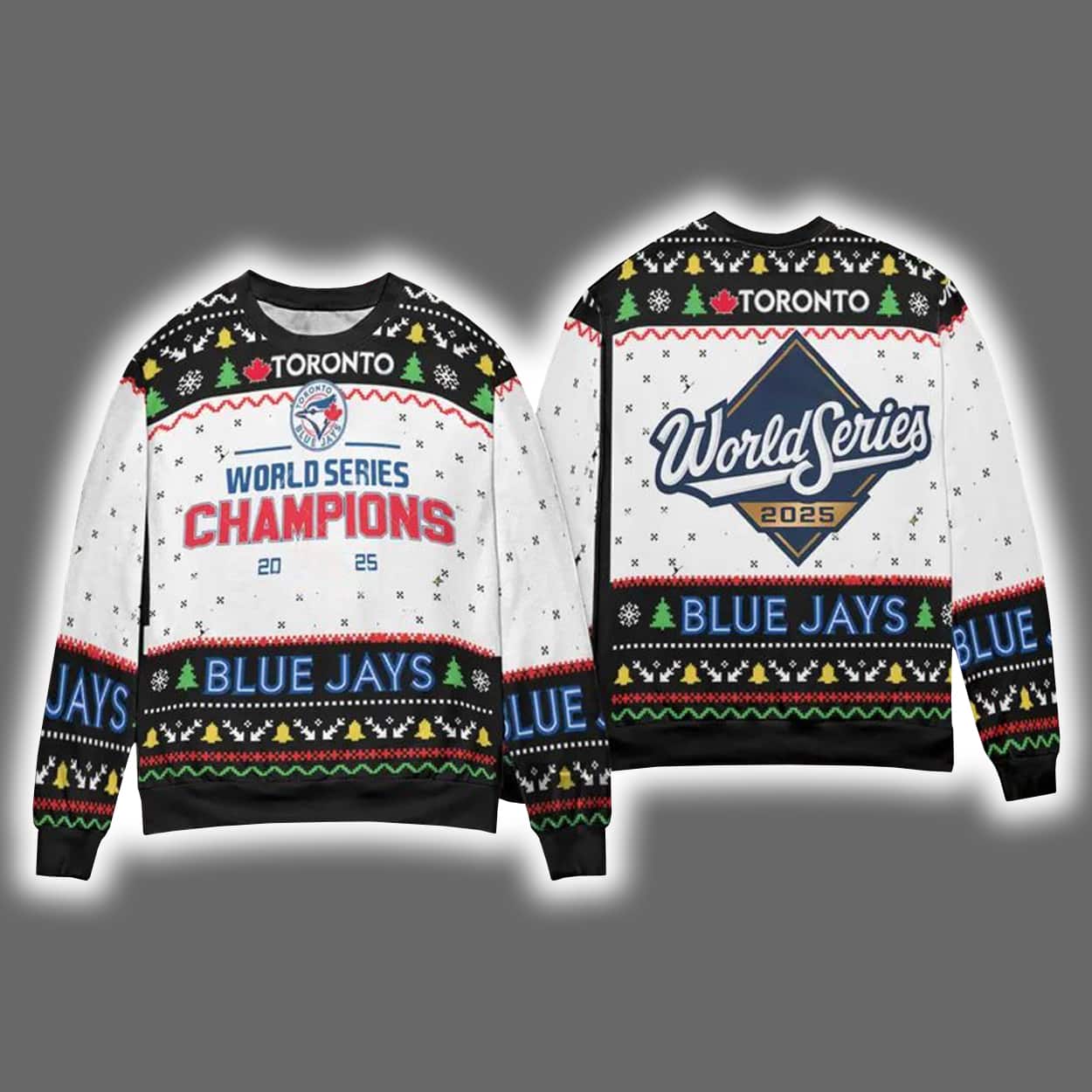 Deck the halls—and yourself—in championship glory with this sweater. This vibrant masterpiece features a front-and-back design bursting with festive flair. On the front, “TORONTO” crowns the chest above a bold “WORLD SERIES CHAMPIONS” banner, flanked by the Blue Jays logo and the victorious year “20” and “25.” Snowflakes, Christmas trees, and geometric patterns in red, green, blue, and white wrap the sweater in seasonal spirit. The back proudly displays a large “World Series 2025” emblem, making sure your fandom shines from every angle.