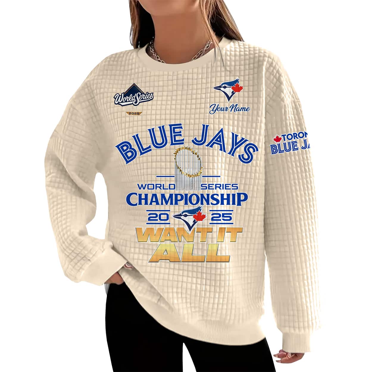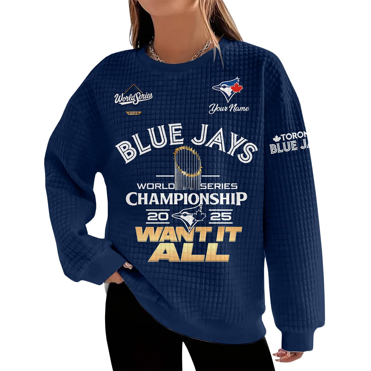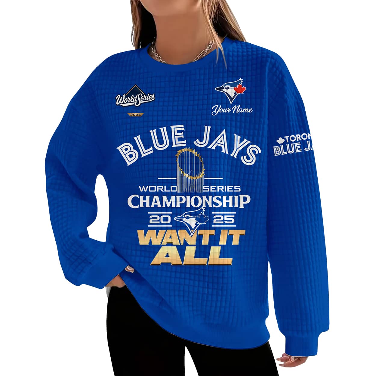 Step into the spotlight with this sweatshirt—a bold, fan-favorite piece that screams victory. The front design features “BLUE JAYS” in commanding white letters, crowned by the “World Series” logo and your personalized name. At the heart of the sweatshirt sits a gleaming championship trophy, surrounded by the words “WORLD SERIES CHAMPIONSHIP 2025,” split by the iconic Blue Jays logo. The phrase “WANT IT ALL” blazes across the bottom in gold, capturing the team’s hunger for greatness. On the right sleeve, “TORONTO BLUE JAYS” adds a finishing touch of pride.