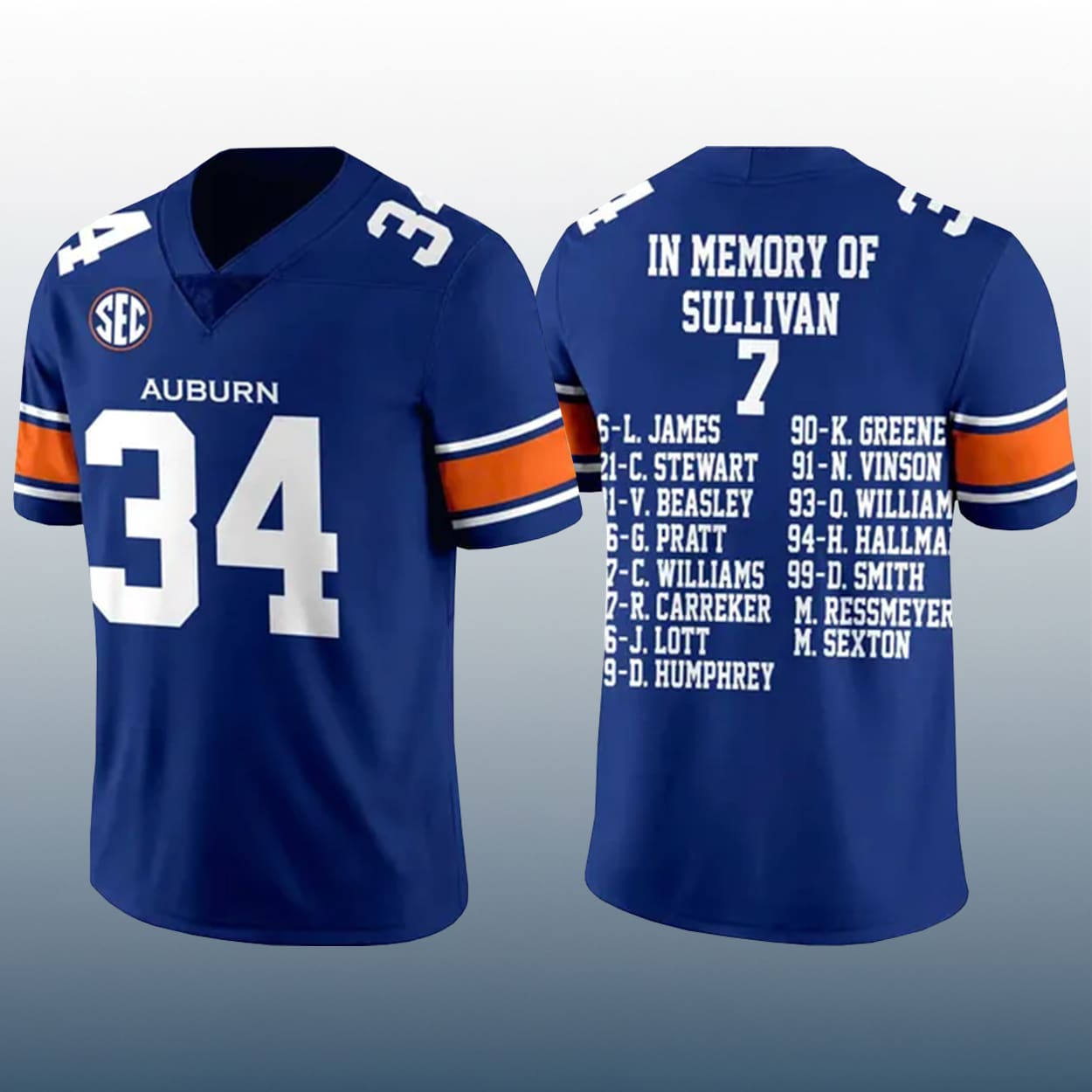 Step into the spirit of Auburn football with this jersey. Drenched in deep navy blue with fierce orange and white sleeve stripes, it’s a visual touchdown. The front proudly displays “AUBURN” above the legendary number 34—Bo Jackson’s iconic digits. Flip it around and you’ll find a heartfelt homage: “IN MEMORY OF SULLIVAN” crowns the back, with the number 7 standing tall beneath it, honoring Auburn great Pat Sullivan. Below, a roll call of warriors—names and numbers of fellow players—line up in two columns like a hall of fame stitched in thread.