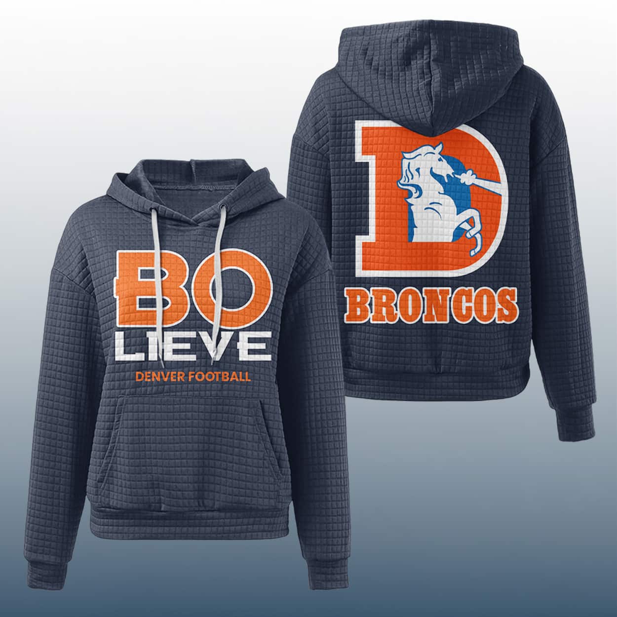 Meet your new go-to hoodie for game days, chill days, and everything in between. This hoodie rocks a deep blue quilted texture that’s as eye-catching as it is cozy. On the front, the word “BELIEVE” gets a Broncos twist—split into “BO” in blazing orange and “LIEVE” in crisp white, stacked with “DENVER FOOTBALL” in smaller orange text below. Flip it around and you’ll find a giant orange “D” housing the team’s iconic white-and-blue horse logo, with “BRONCOS” boldly stamped underneath in orange letters outlined in white. It’s a wearable pep talk for fans who never stop believing.