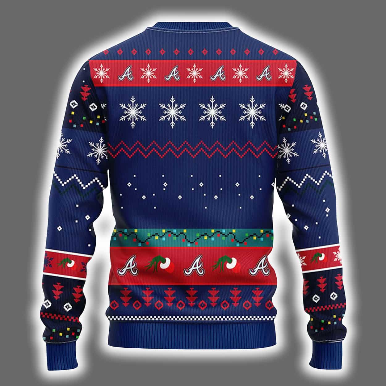 This isn’t your average holiday sweater—it’s a bold blend of Christmas spirit and baseball pride. Featuring a dark blue backdrop sprinkled with white snowflakes and red festive patterns, this sweater brings the drama with a playful centerpiece: the Grinch’s iconic green hand swiping a Christmas ornament shaped like the Atlanta Braves logo. Rows of zigzags, snowflakes, and baseball-themed icons line the sleeves and hem, creating a look that’s as cheeky as it is charming. Whether you’re at a holiday party or cheering from the stands, this sweater makes sure your team spirit shines brighter than Rudolph’s nose.