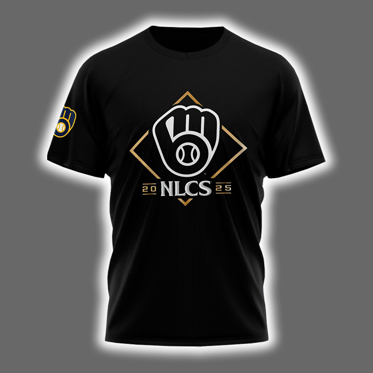 This isn’t just a shirt—it’s a celebration. The front of this shirt features the iconic Milwaukee Brewers glove logo, cleverly forming the letters “M” and “B,” framed inside a golden diamond that screams victory. Flanking the diamond, the year “2025” anchors the moment in baseball history, while “NLCS” boldly declares the team’s triumph. Flip it around and you’ll find the rallying cry of the season: THE POWER OF FRIENDSHIP in bold white letters, sitting above a circular Brewers emblem flanked by golden laurel branches. Even the sleeves get in on the action, each sporting a mini glove logo—because every angle deserves a little team spirit.