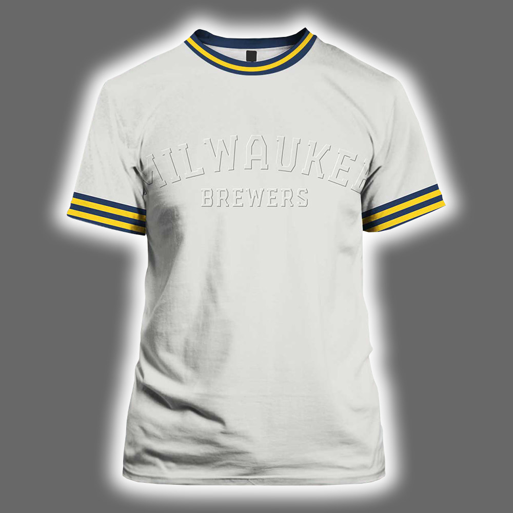 This shirt isn’t just a giveaway—it’s a tribute to the Brewers’ legacy and the fans who live it. The embossed lettering adds a tactile twist, inviting you to feel the pride. The striped collar and cuffs channel vintage baseball vibes with a modern twist, making it perfect for those who think beyond the scoreboard and wear their loyalty with quiet confidence.