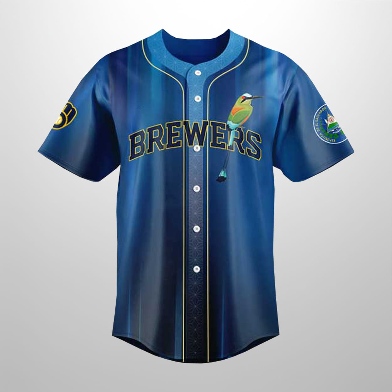 Step up to the plate with a look that blends Milwaukee’s baseball soul with the vibrant spirit of El Salvador. This jersey features a stunning deep blue gradient, accented with vertical light streaks that give it a modern, energetic feel. Across the chest, the iconic “Brewers” name is joined by a colorful guest: the Torogoz, El Salvador’s national bird. This design swaps the standard team colors for a palette inspired by the Salvadoran flag, making it an instant standout in any fan’s collection.