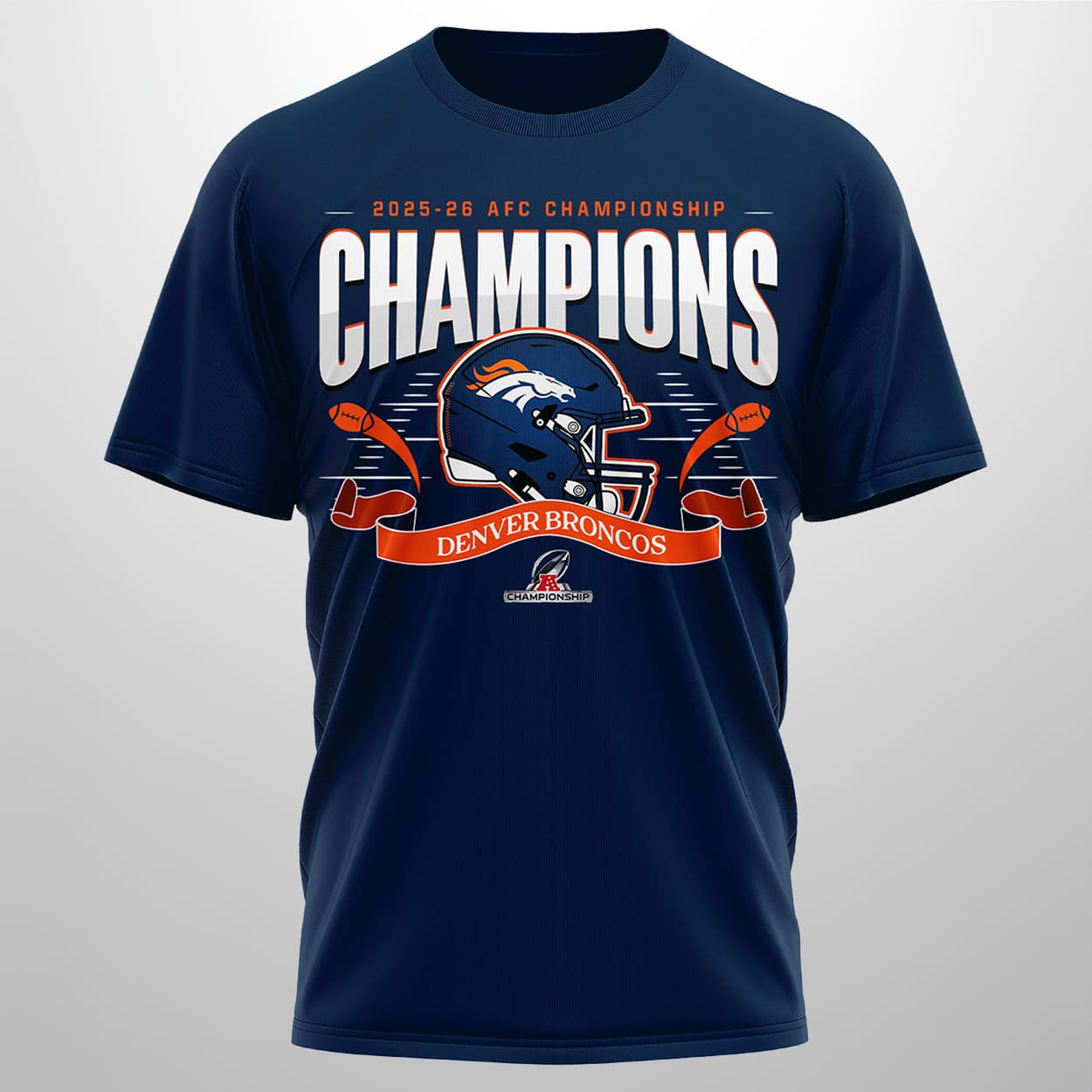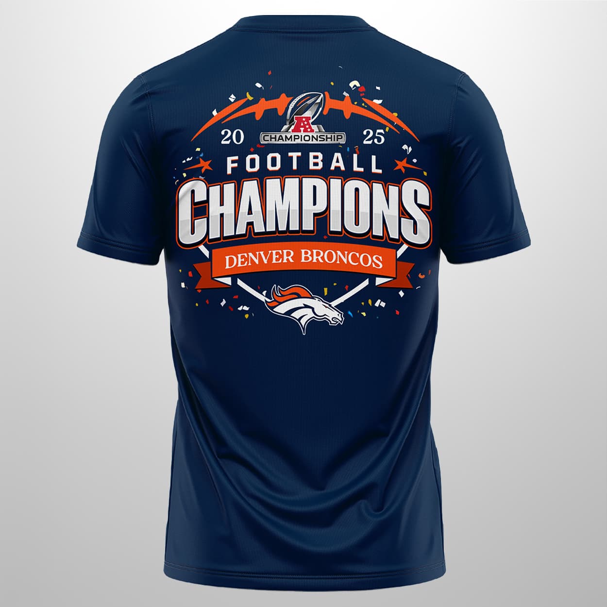 Turn heads and spark high-fives with this shirt—a wearable celebration of back-to-back dominance. The front proudly declares “CHAMPIONS” in bold white lettering, with “2025-2026 AFC CHAMPIONSHIP” perched above like a crown. Centered beneath is a fierce Broncos helmet graphic, flanked by a banner reading “DENVER BRONCOS” and a stylized football icon that seals the deal. Flip it around and the party continues: “FOOTBALL CHAMPIONS” blazes across the back, framed by the year “2025” and a red banner shouting “DENVER BRONCOS,” all surrounded by stars, confetti, and footballs. It’s a full-on victory parade in shirt form.