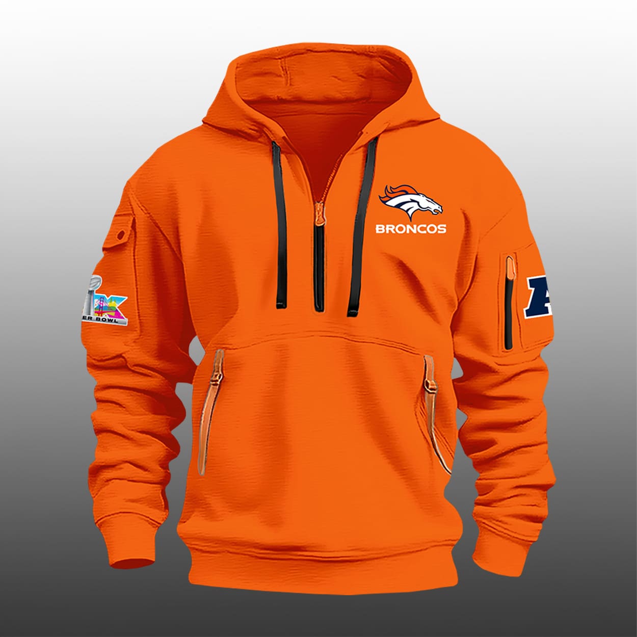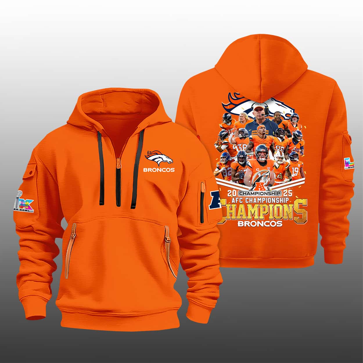 Celebrate a season that redefined Mile High magic with this hoodie. This isn’t just a piece of fan gear; it’s a vibrant tribute to a team that defied the odds to reclaim the conference throne. Drenched in iconic Denver orange, this half-zipper hoodie features sleek black accents and utility-style sleeve pockets, blending high-performance aesthetics with the grit of a championship run. Whether you’re at the stadium or on the streets, this hoodie ensures your loyalty is seen from a mile away.