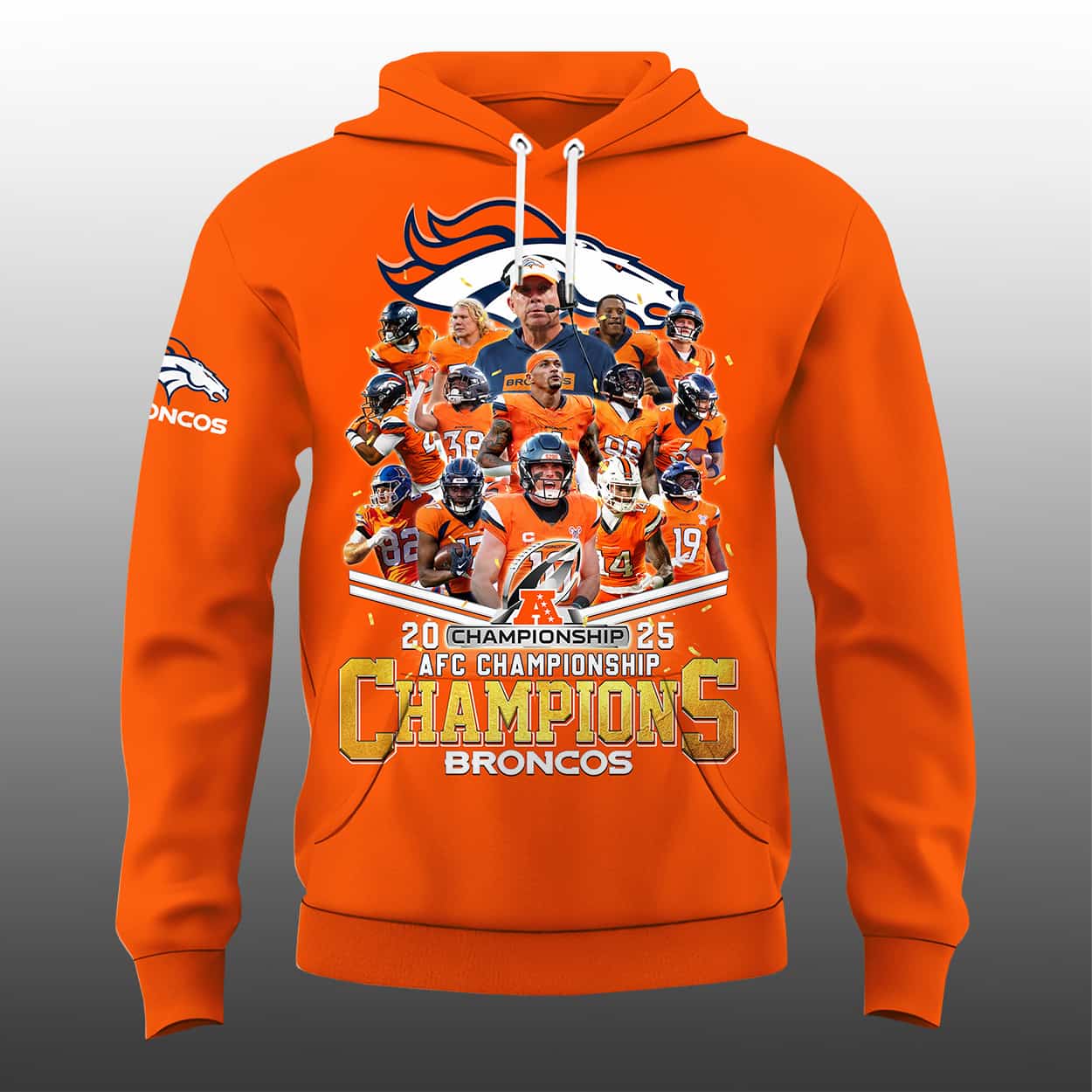 Celebrate the Broncos’ legendary 2025 season with this Broncos 2025 AFC Champions Hoodie. Featuring a star-studded player collage and bold championship graphics, it’s the ultimate gear for the Orange Crush.