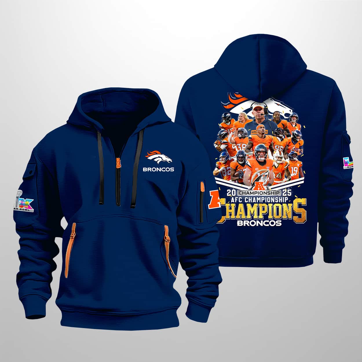 Step into the spotlight with this hoodie—a wearable tribute to gridiron greatness. This navy blue hoodie sports a sleek quarter zip design with eye-catching orange accents that pop like a touchdown celebration. On the front, the left chest proudly displays the Broncos logo and name, a subtle nod to your unwavering loyalty. But the real showstopper is the back: a high-energy graphic bursting with action, featuring Broncos players mid-play, the iconic team logo, and the triumphant text “2025 AFC CHAMPIONS BRONCOS.” It’s not just a hoodie—it’s a highlight reel you can wear.