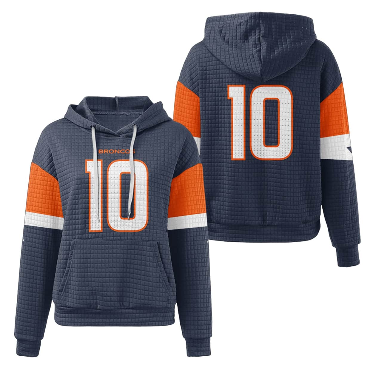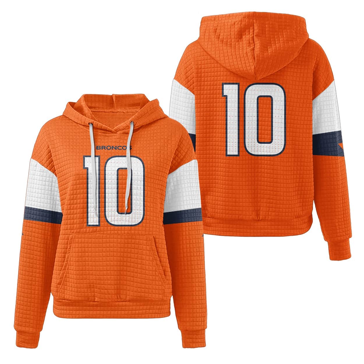 Make a statement from the tailgate to the couch with this hoodie. This eye-catching orange hoodie is all about bold moves and bigger energy. The front and back feature the number “10” in crisp white with a navy outline—so there’s no mistaking who you’re backing. Above the front number, “BRONCOS” is printed in solid blue, loud and proud. The sleeves bring extra attitude with white and navy horizontal stripes, while the quilted texture adds depth and dimension. With a front kangaroo pocket and drawstring hood, it’s built for comfort—but designed to stand out.