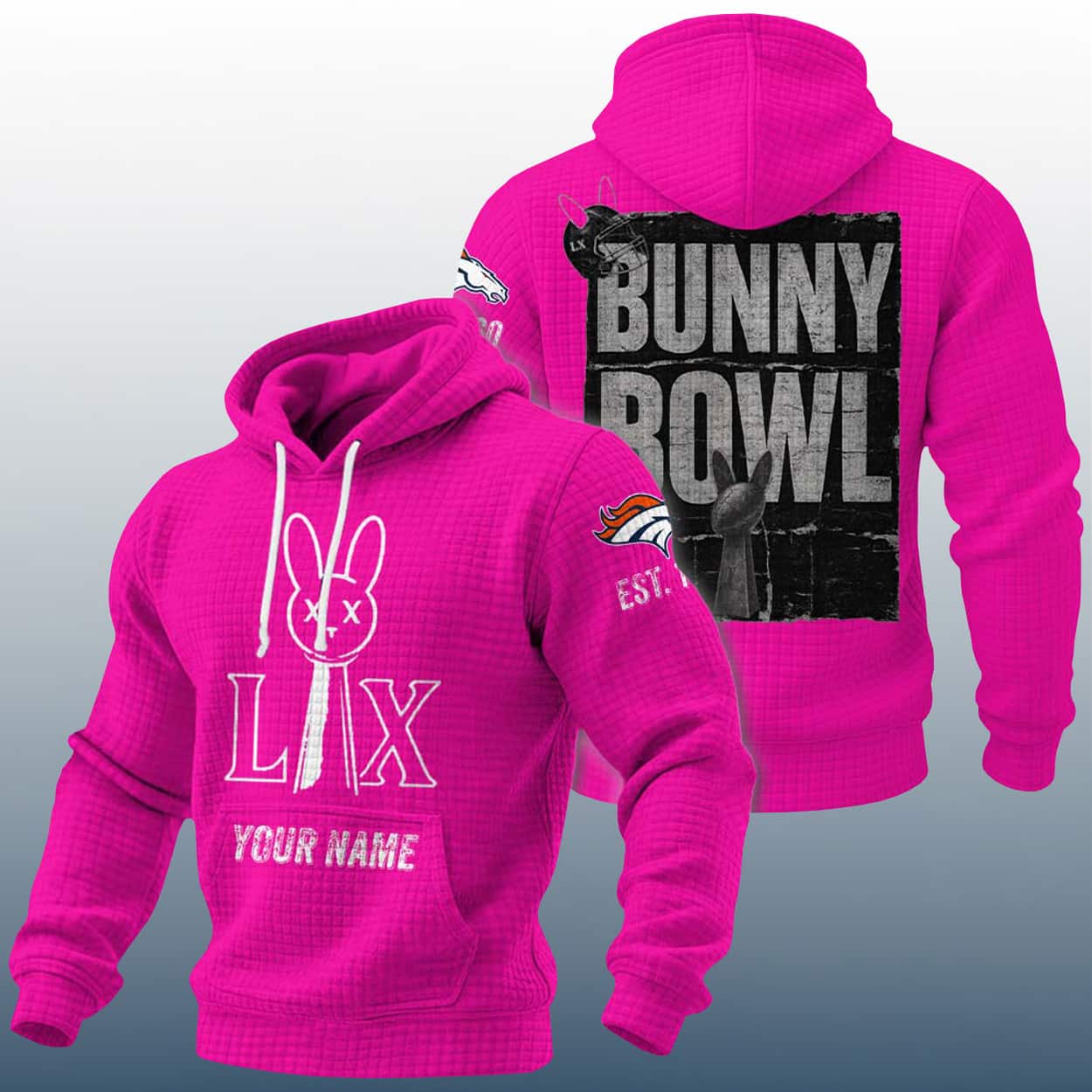 This hoodie is where football fever meets playful flair. On the front, a stylized bunny logo sits above the bold “LX,” with space for your custom name—because legends deserve personalization. The left sleeve proudly sports the Broncos logo, grounding this whimsical piece in real gridiron heritage. Turn around and you’ll find the showstopper: “BUNNY BOWL” in distressed, oversized lettering, backed by a fierce bunny graphic that’s equal parts adorable and intense. This hoodie isn’t just cozy—it’s a conversation starter.