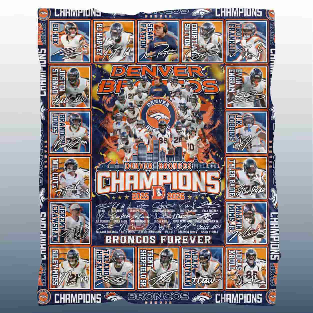 Celebrate the Mile High magic with this blanket, a vibrant tribute to Denver’s latest Super Bowl triumph. At the heart of the design, the iconic Broncos logo charges forward beneath the bold proclamation: “BRONCOS CHAMPIONS 2025 2026.” Surrounding this centerpiece are dynamic portraits of the season’s key players, each proudly labeled with their name and jersey number. The phrase “BRONCOS FOREVER” anchors the spirit of loyalty, while a border of repeating “CHAMPIONS” shouts victory from every edge. Scattered across the blanket are printed player signatures, adding a personal touch to this fan-favorite keepsake.