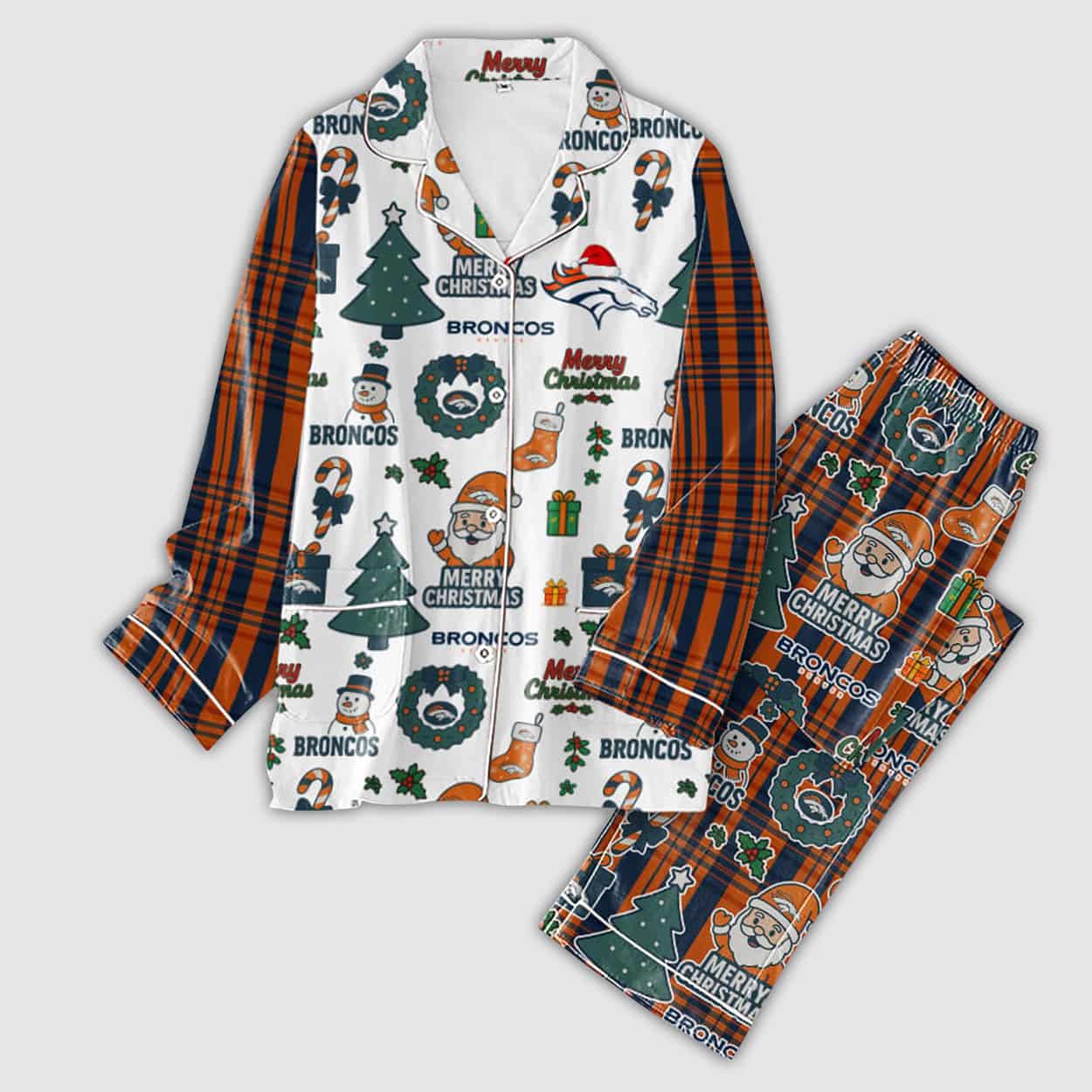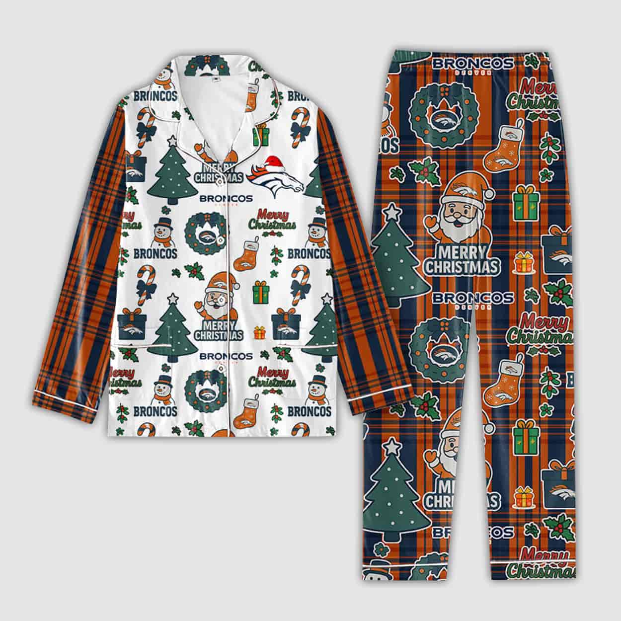 Celebrate the season with a touchdown-worthy twist in this pajama set. This vibrant sleepwear combo features a white base bursting with holiday cheer—Santa Claus, Christmas trees, presents, and football helmets all mingling with Broncos logos and the spirited phrases “Merry Christmas” and “BRONCOS.” One pant leg mirrors the top’s festive collage, while the other and the sleeves pop with orange, blue, and white plaid for a playful contrast. It’s the perfect outfit for cozy nights, game-day lounging, or making a statement at your next holiday pajama party.