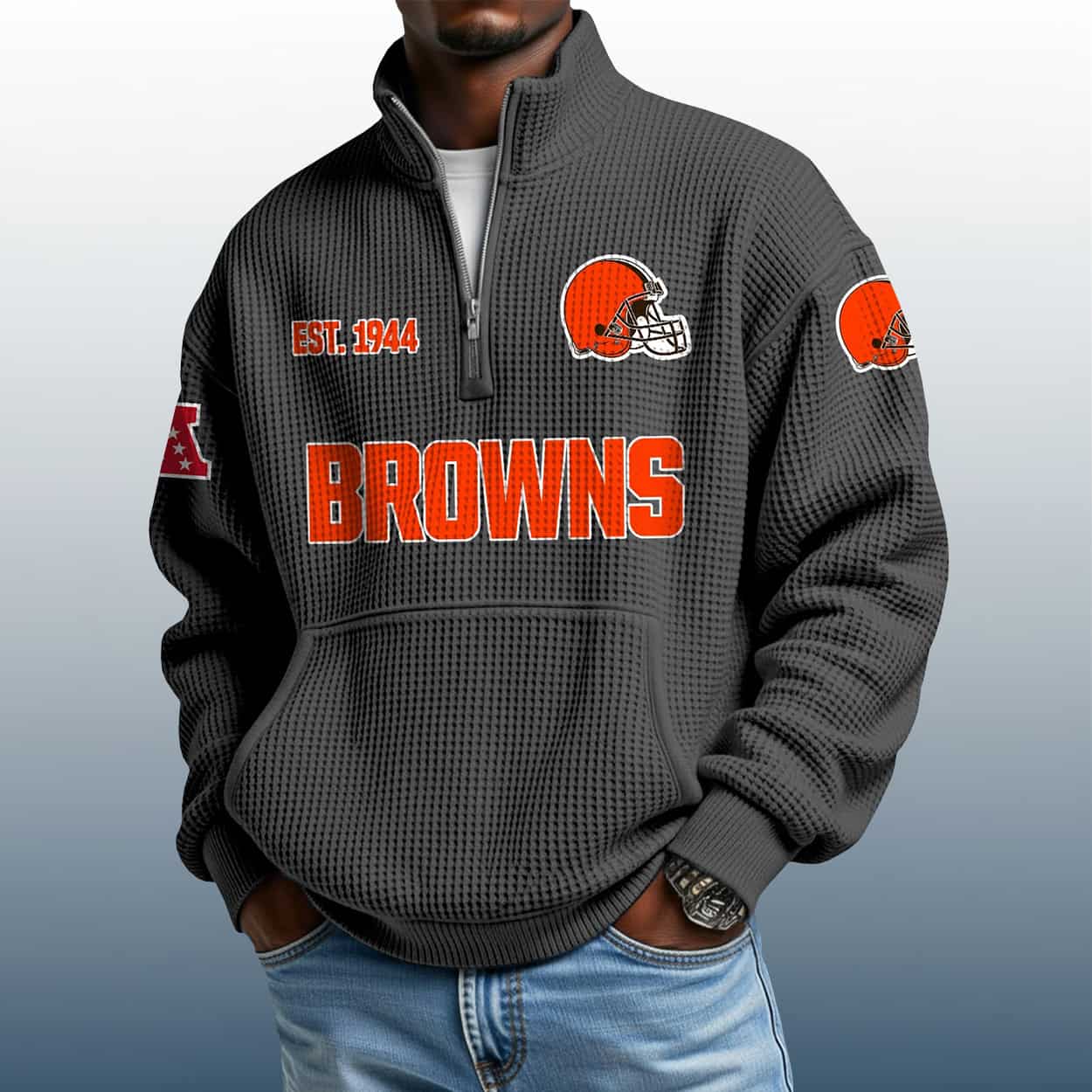 Turn heads and spark conversations with this sweatshirt—a bold tribute to Cleveland football heritage. This dark gray pullover features a textured waffle design and a sleek stand collar with a half-zip closure for versatile wear. Across the chest, “BROWNS” blazes in red-orange lettering, flanked by the team’s classic helmet logo and “EST. 1944” in matching tones to mark the franchise’s founding year. The left sleeve adds a mysterious red “A” with a white outline, while the right sleeve proudly repeats the helmet logo, making this sweatshirt a full-field celebration of Browns fandom.