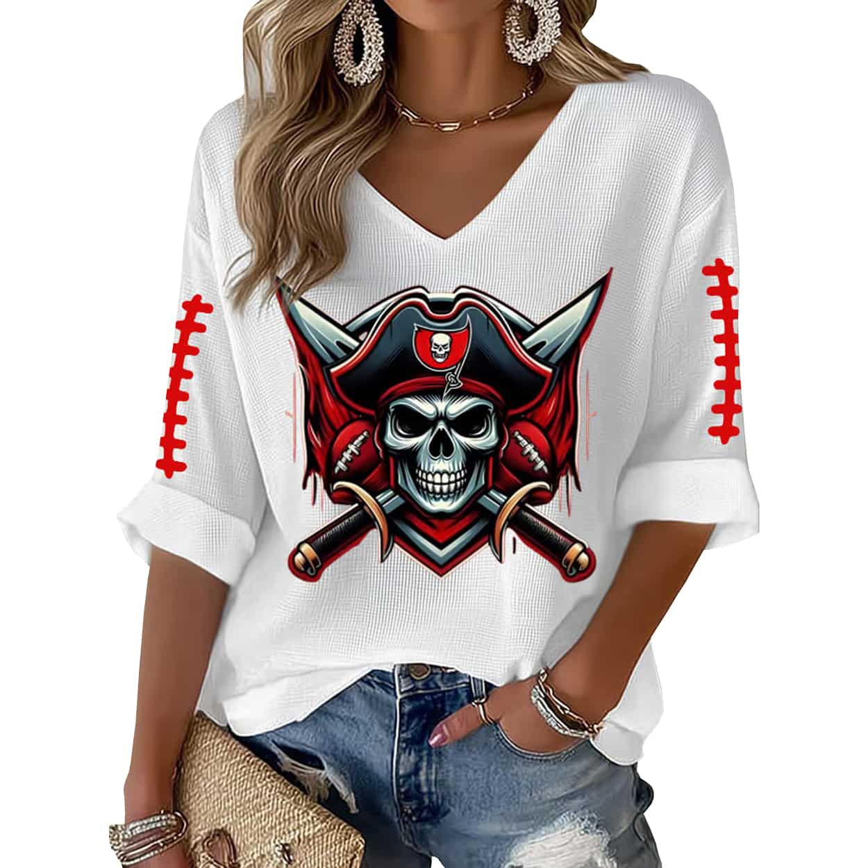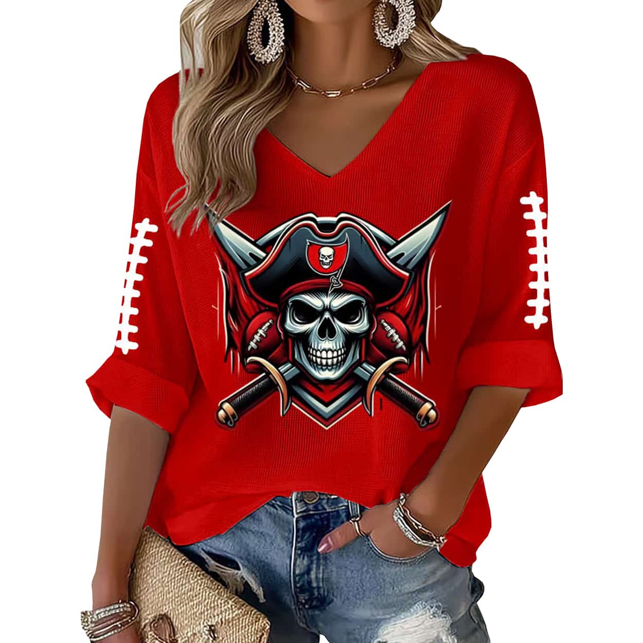 Turn heads and break rules with this shirt. This fiery red V-neck top features a commanding graphic of a skull donning a pirate hat, flanked by crossed swords—an unmistakable nod to swashbuckling swagger. The pirate hat itself sports a mini skull emblem, doubling down on the rebellious theme. White lace-up detailing on the sleeves adds a sporty twist. Whether you’re tailgating or taking over the town, this shirt is your ticket to unapologetic style.