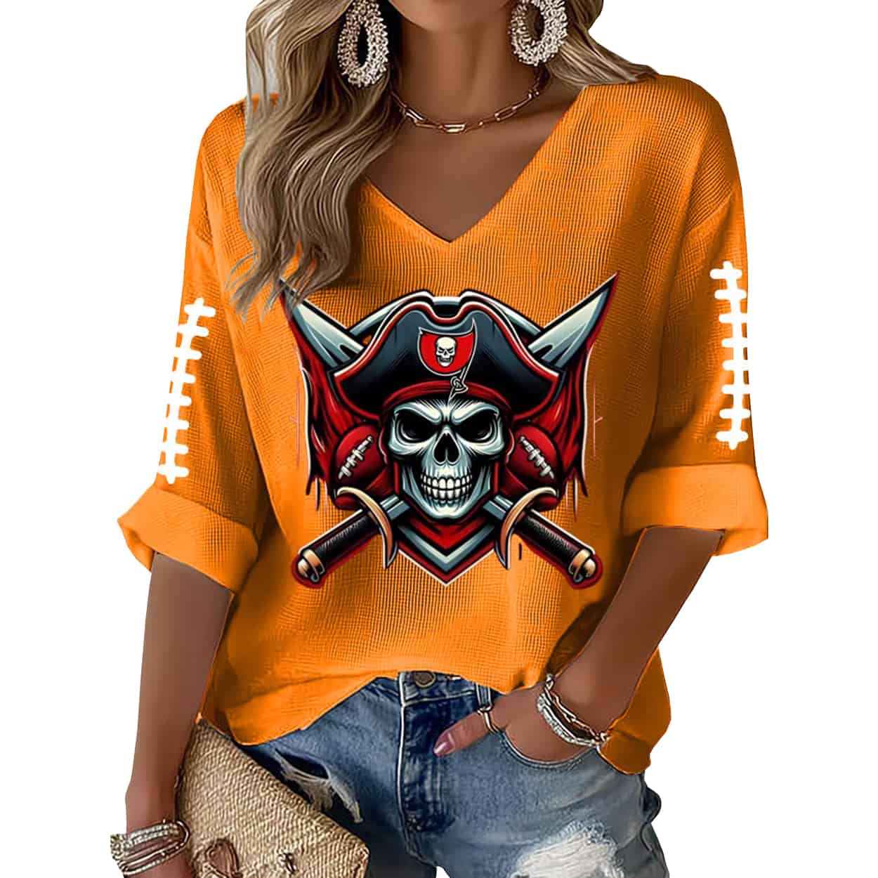 Unleash your inner rebel with the Buccaneers Football Print Waffle Long Sleeve T-Shirt—where fierce fashion meets fearless attitude. A bold graphic, lace-up sleeves, and pirate flair make this a must-have for game day and beyond.