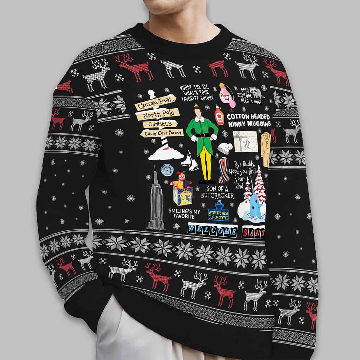 More than just a sweater, this is a joyful, satirical statement. Buddy represents relentless sincerity clashing with the modern, cynical world. By wearing this, you are staging a sweet, syrup-fueled protest against the “cotton-headed ninny muggins” of corporate culture and joyless holiday consumerism. It’s a loud declaration that you believe in a simple truth—even if that truth requires a four-food-group diet of candy, candy canes, candy corn, and syrup.