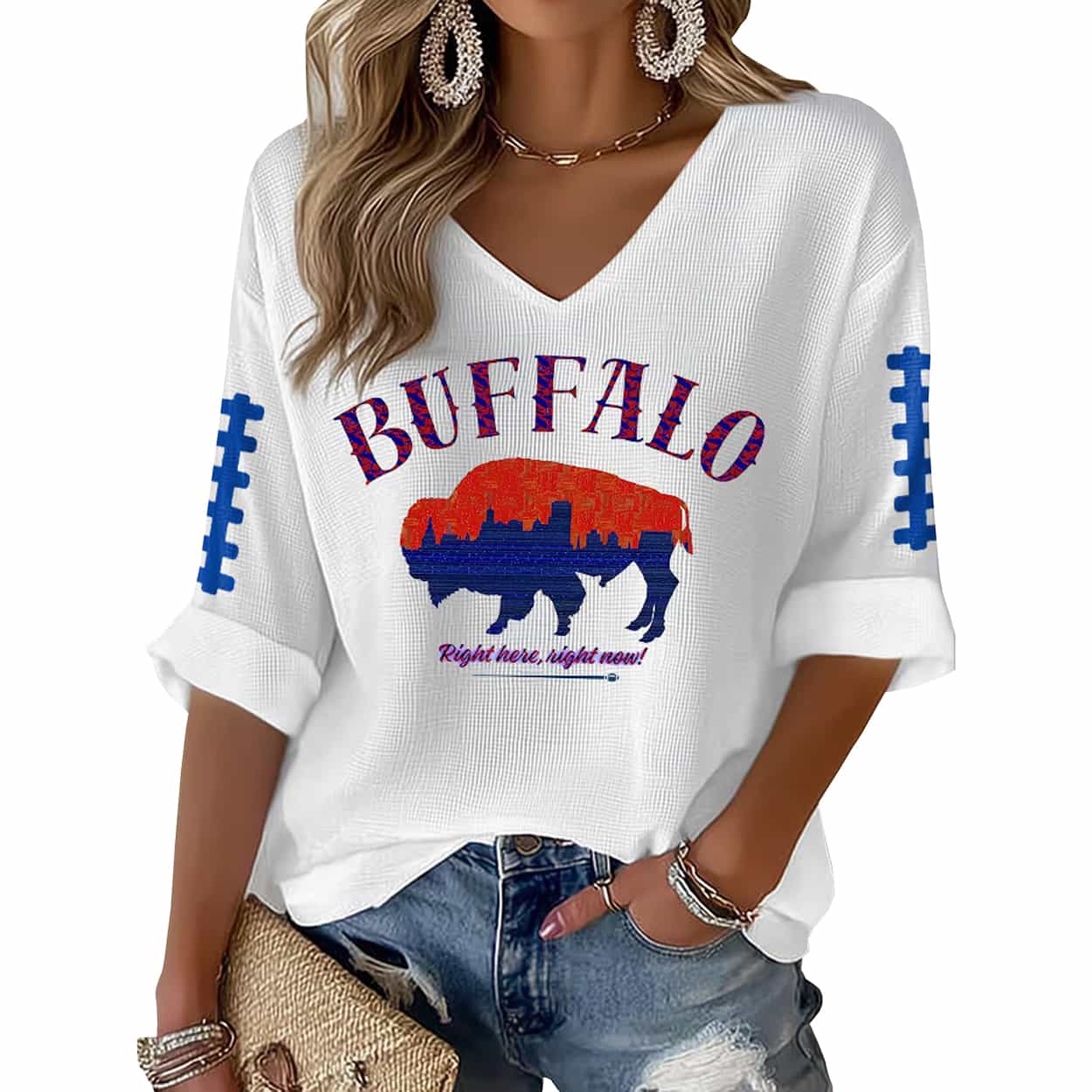 Celebrate your Buffalo pride with the Buffalo Football Right Here Right Now Waffle Long Sleeve Shirt—a bold, stylish tribute to city spirit and game-day energy. Perfect for fans who love fashion with meaning.