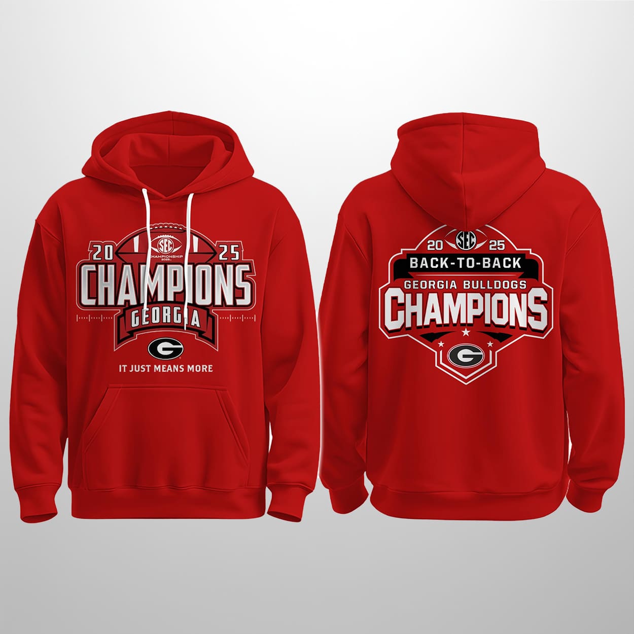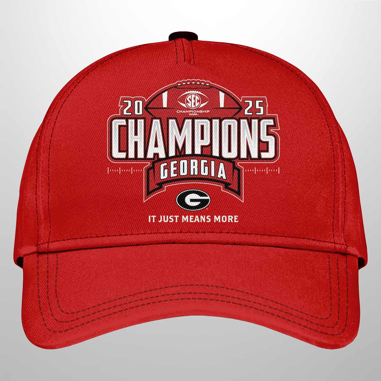 Own the moment with this set—a triple-threat tribute to Georgia’s gridiron greatness. The hoodie roars with “2025 SEC CHAMPIONS GEORGIA” and the rallying cry “IT JUST MEANS MORE,” while the back flexes “BACK-TO-BACK CHAMPIONS” in bold, unmistakable style. The joggers keep the energy flowing with “2025 CHAMPIONS GEORGIA” stamped proudly on the leg, reminding fans of the dynasty in motion. Top it off with the cap: a football graphic, the SEC logo, and “CHAMPIONS GEORGIA” wrapped around the iconic “G”—a crown for every Bulldog believer.