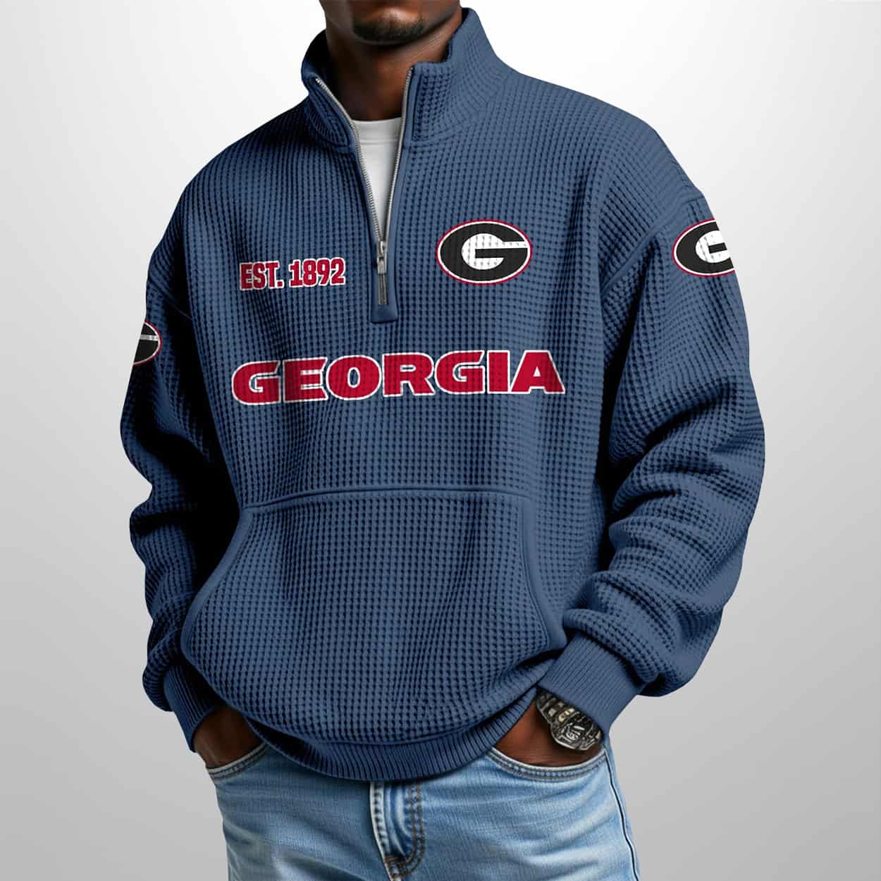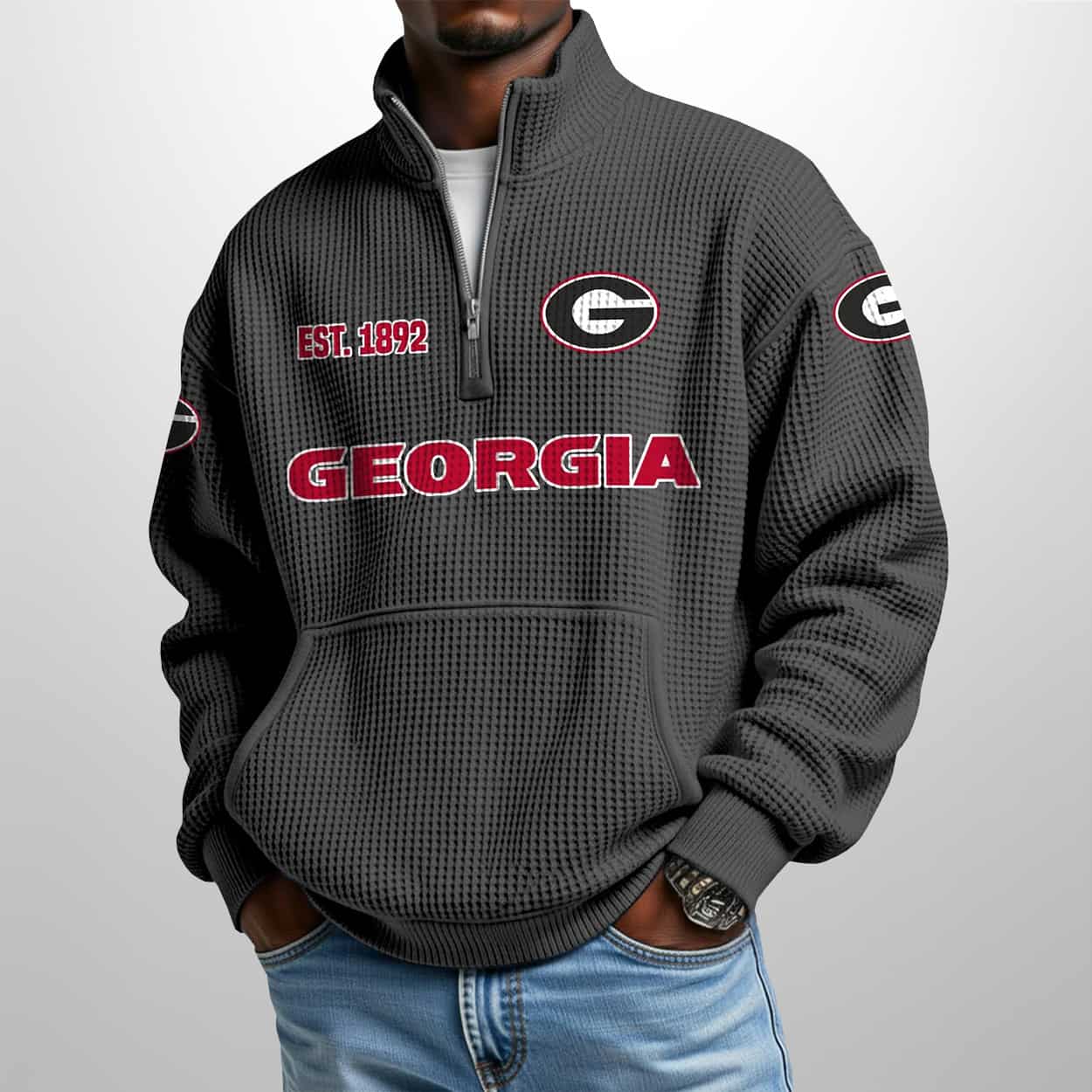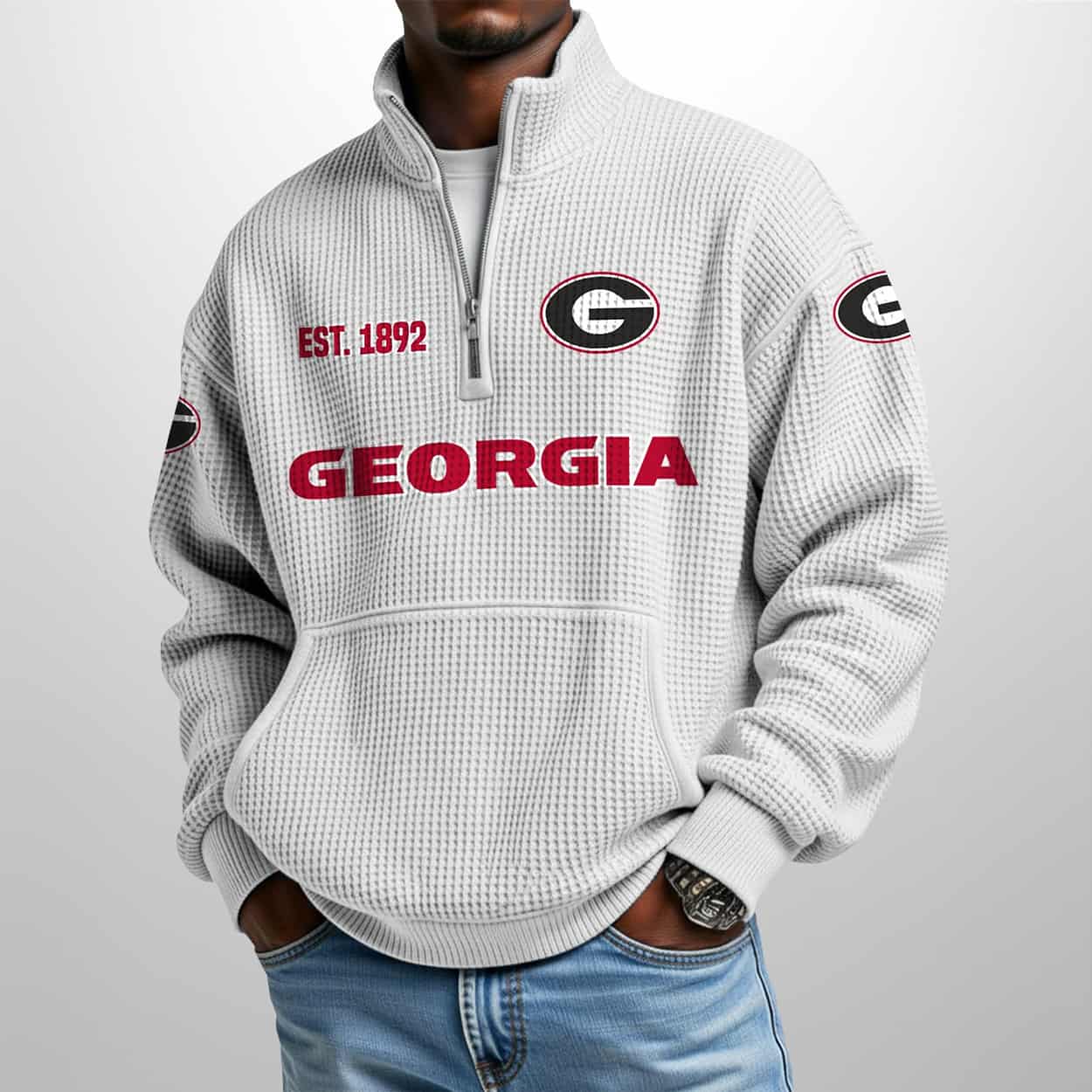 Celebrate Georgia pride with the Bulldogs Est 1892 Waffle Stand Collar Half Zip Sweatshirt—where classic grit meets bold collegiate flair.