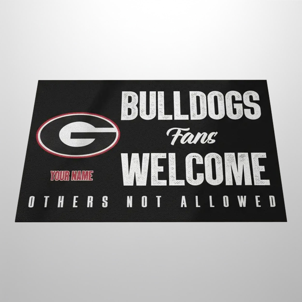 Step into the world of Bulldog Nation with a doormat that speaks louder than a stadium roar. Featuring the iconic Georgia “G” logo on a sleek black background, this sign-style doormat boldly declares: “BULLDOGS Fans WELCOME – YOUR NAME – OTHERS NOT ALLOWED.” It’s not just a greeting—it’s a declaration. Whether placed at your front door, game room, or tailgate setup, this piece instantly sets the tone: loyal fans only, rivals beware. The customizable “YOUR NAME” section adds a personal touch, making it uniquely yours.