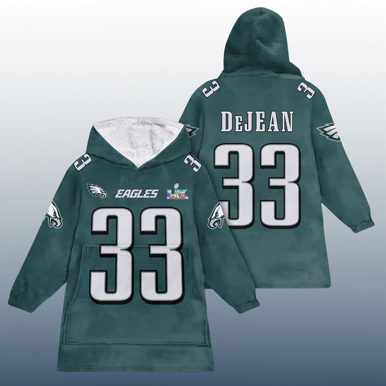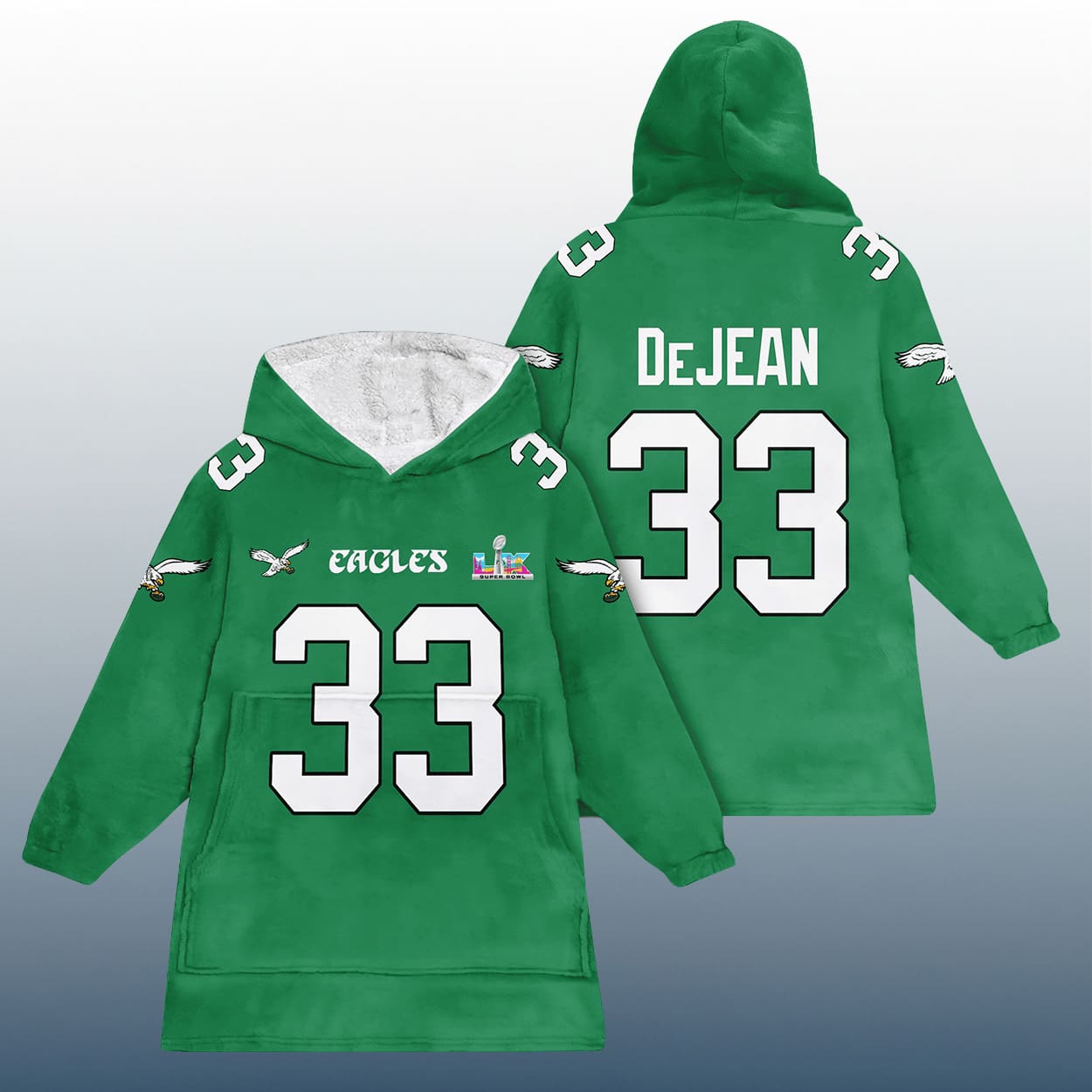 Get ready to tackle chilly days and game nights with this hoodie. This hoodie is a touchdown in style, featuring a vibrant green design that mimics a football jersey. The front showcases the iconic Eagles logo, the bold “EAGLES” text, and a commemorative SB LX emblem—because legends deserve legendary gear. Flip it around and you’ll find the name “DeJEAN” soaring above the number “33,” printed loud and proud on the back and front.