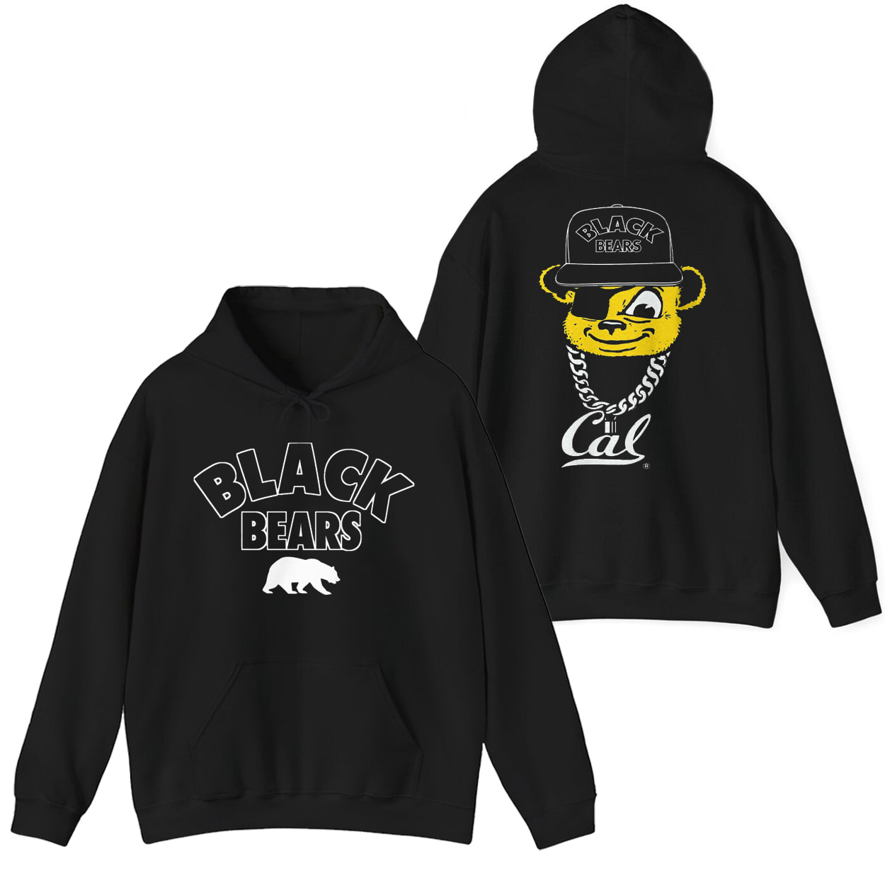 Turn heads from every angle with this shirt. The front keeps it classic with “BLACK BEARS” in bold white lettering, anchored by a sleek bear silhouette that says, “I’m here to dominate.” Flip it around and the vibe shifts—meet the bear mascot like you’ve never seen him before. Rocking a black cap stamped with “BLACK BEARS,” a gold chain, and a fierce urban expression, this bear is dripping with swagger. Below the illustration, the cursive “Cal” adds a nod to tradition with a twist of cool.