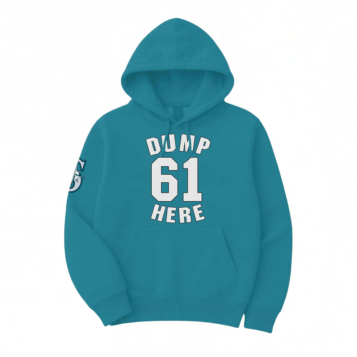 This teal-colored tee isn’t just apparel—it’s attitude. Front and center, bold white lettering commands attention: “DUMP 61 HERE.” Whether you’re in the bleachers or strolling the streets, this shirt makes a statement. The number 61 nods to Cal Raleigh’s jersey, while the phrase “Dump Here” cheekily celebrates his reputation for delivering bombs when it counts. A small emblem on the sleeve adds a splash of flair, possibly featuring a stylized logo that ties back to the Mariners’ coastal spirit.