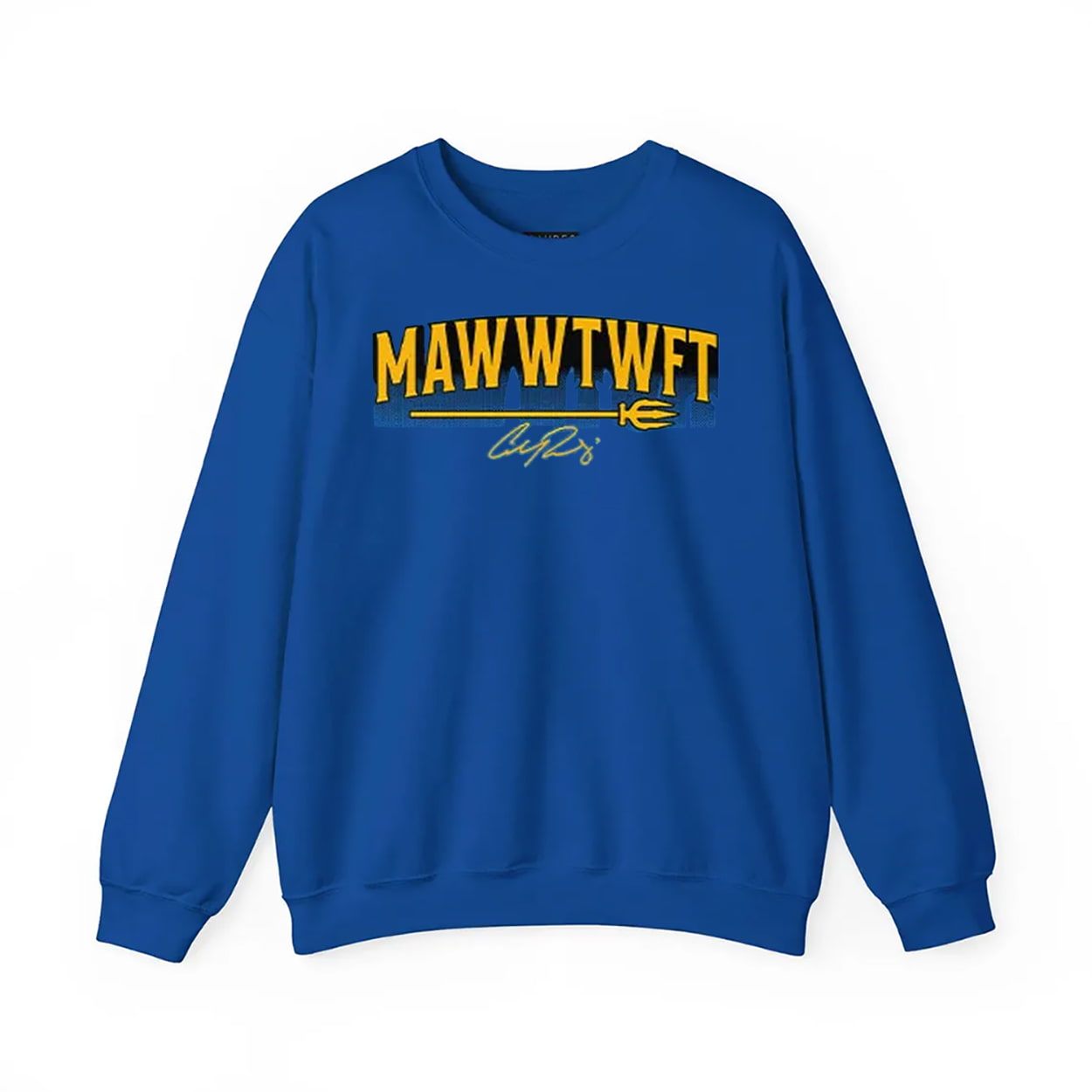 This shirt is a home run for fans who love a little mystery with their Mariners pride. Front and center, the shirt features the eye-catching acronym “MAWWTWTFT” in bold yellow and white lettering—an inside joke, a rally cry, or maybe just a vibe. Beneath the text, a golden trident symbol adds a splash of mythic power, while a stylized signature gives the design a personal touch, nodding to none other than Cal Raleigh, the Mariners’ clutch-hitting catcher. Whether you’re at the ballpark or just flexing your fandom around town, this shirt makes a statement without saying too much.