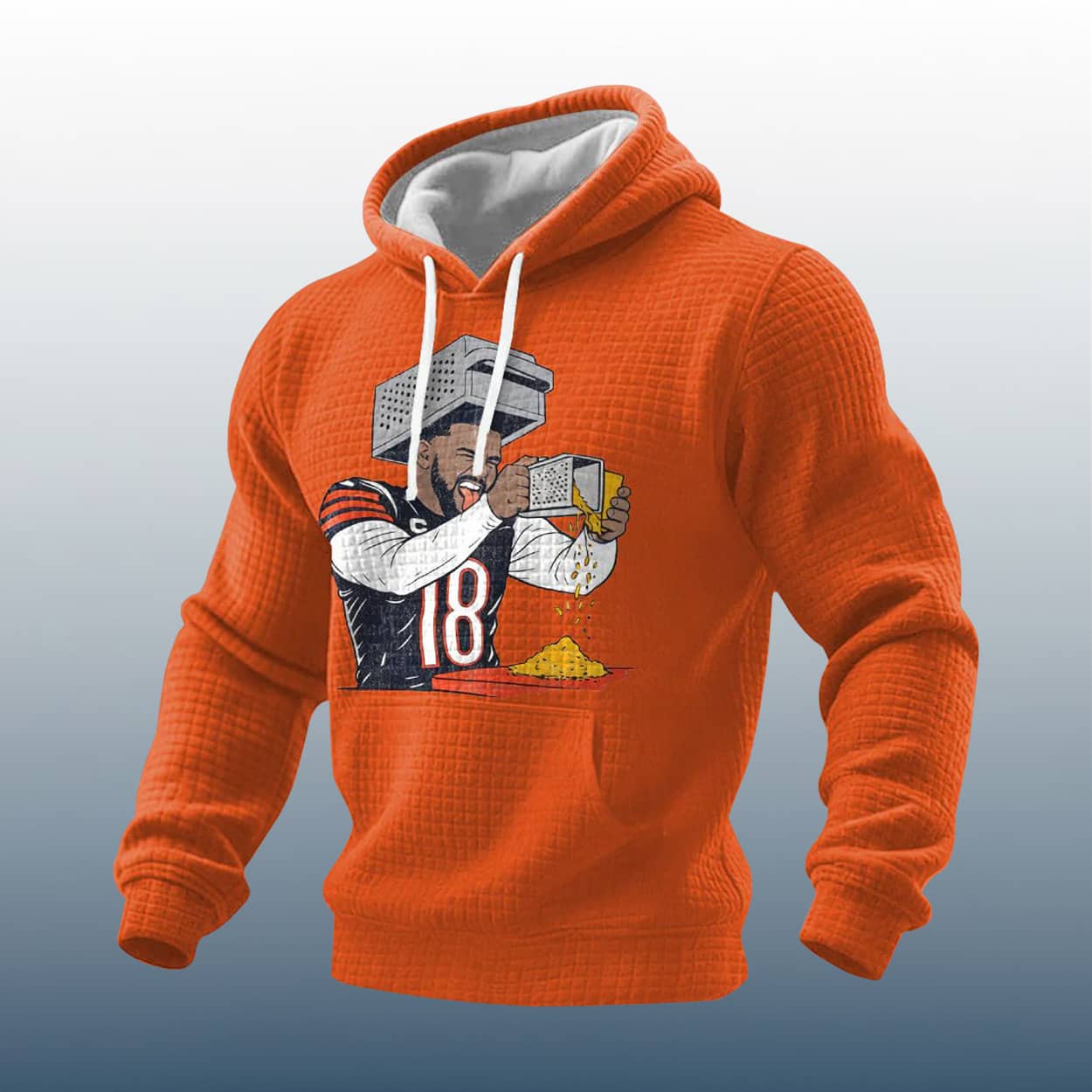 Turn heads and stir laughs with the Caleb Williams Grating Cheese Funny Waffle Hoodie—a bold blend of football fandom and cheeky culinary humor that’s perfect for game day or any day.