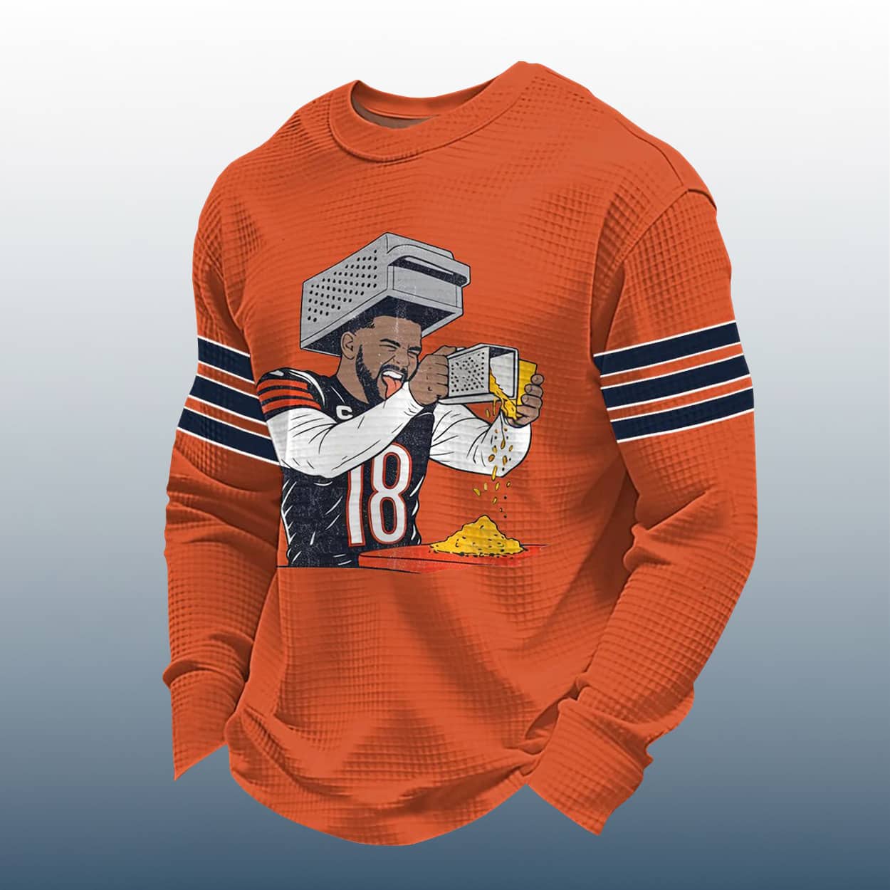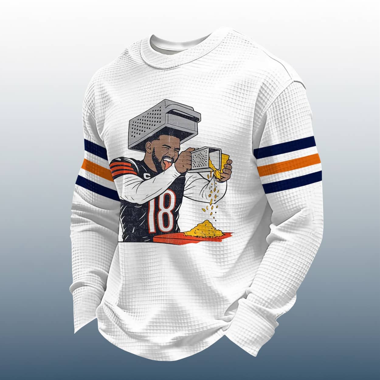 Celebrate Caleb Williams’ epic post-game troll with this Caleb Williams Grating Cheese Print Waffle Long Sleeve T-Shirt featuring the Bears QB grating cheese like a pro. A bold tribute to Chicago’s playoff triumph and football’s spiciest rivalry.