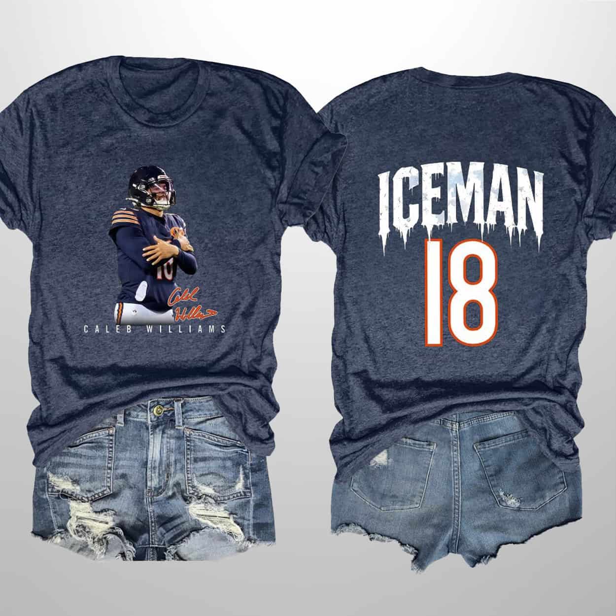 This shirt is a fan-favorite tribute to Chicago’s newest football phenom. On the front, a bold graphic captures Williams in full command—arms crossed, eyes locked in, rocking the navy and orange with signature flair. His name sits below in crisp white lettering, topped with a stylized autograph that adds a personal touch. Flip the shirt around, and you’re hit with “ICEMAN” in frosty white block letters, dripping with icicle detail, and the number “18” in bold orange and white. It’s a double-dose of attitude and admiration.