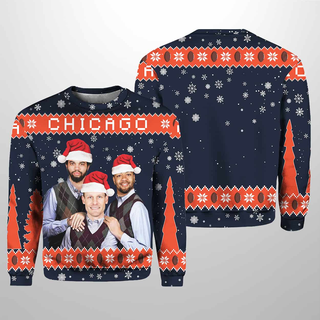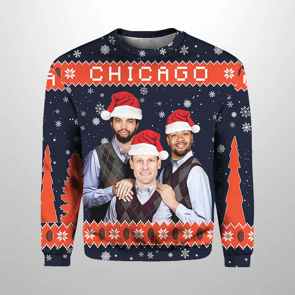Turn heads this holiday season with this sweater—a festive tribute to the city’s rising stars. Set against a navy blue backdrop, the front showcases three smiling figures in Santa hats: Caleb Williams, Rome Odunze, and Ben Johnson, dressed in cozy collared layers. Above them, “CHICAGO” blazes in bold red letters, anchoring the design with hometown pride. Snowflakes and stylized Christmas trees dance across the sleeves and lower panels, while the back continues the wintry theme with red-orange patterns and flurries, keeping the holiday vibes strong from every angle.