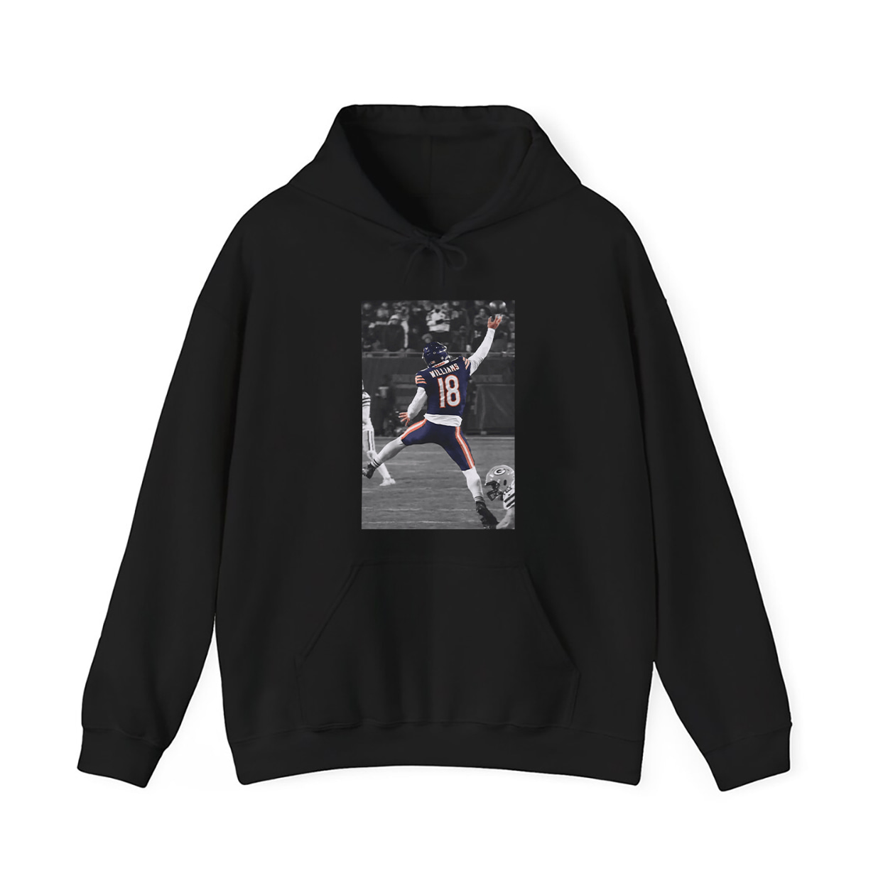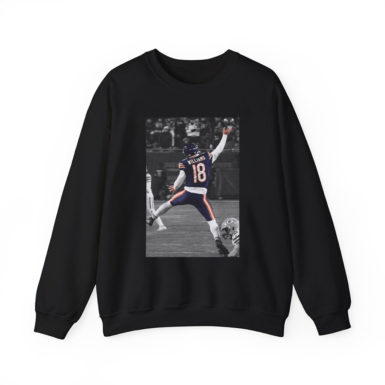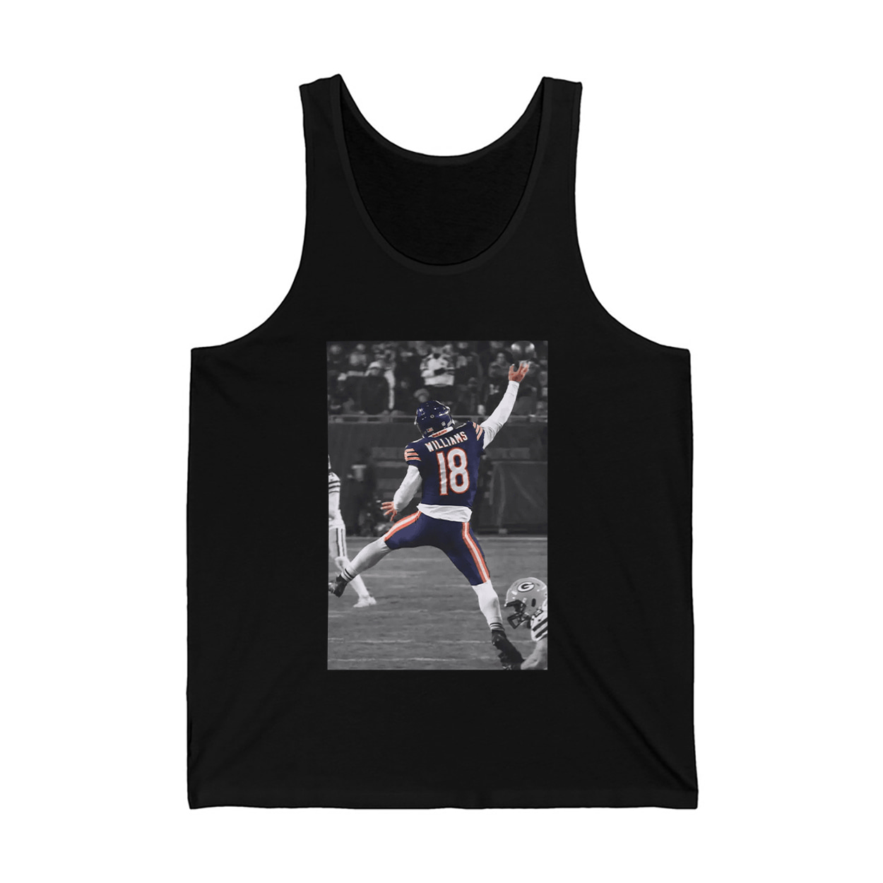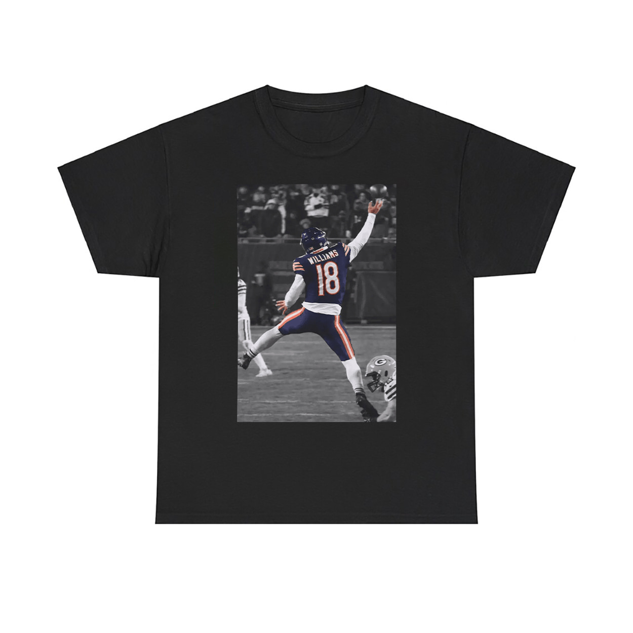 This isn’t just a shirt—it’s a snapshot of greatness. This shirt captures the exact moment when everything went wrong… and one man made it right. With the pocket collapsing and defenders closing in, Williams didn’t flinch. He soared—delivering a pinpoint pass mid-air. The image on the tee freezes that unforgettable frame: Williams in full color, airborne, arm raised, leg lifted, while the grayscale background fades into insignificance. The name “WILLIAMS” and number “18” pop with pride, making this tee a must-have for fans who live for the clutch.